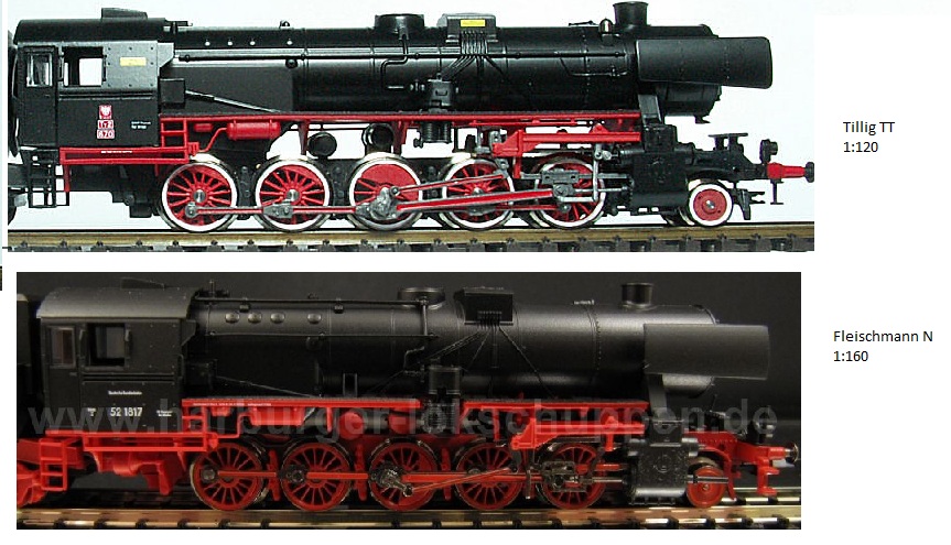 Przełamując nieco dyskusję pozwolę sobie na takie małe porównanie modelu Tilliga w skali TT z modelem tego samego parowozu prod. Fleischmanna w skali N. Zdjęcie TT pochodzi z tego tematu - zaś zdjęcie w skali N pochodzi z portalu www.1zu160.de. Osobiście zbieram obie te skale i mam parowóz BR52 Fleischmanna, może dlatego podaję to porównanie bo nieco się zawiodłem jakością Tilliga. Nie jest źle - parowóz jest ładny, ale chyba można było trochę lepiej. Cóż... ponarzekać zawsze można