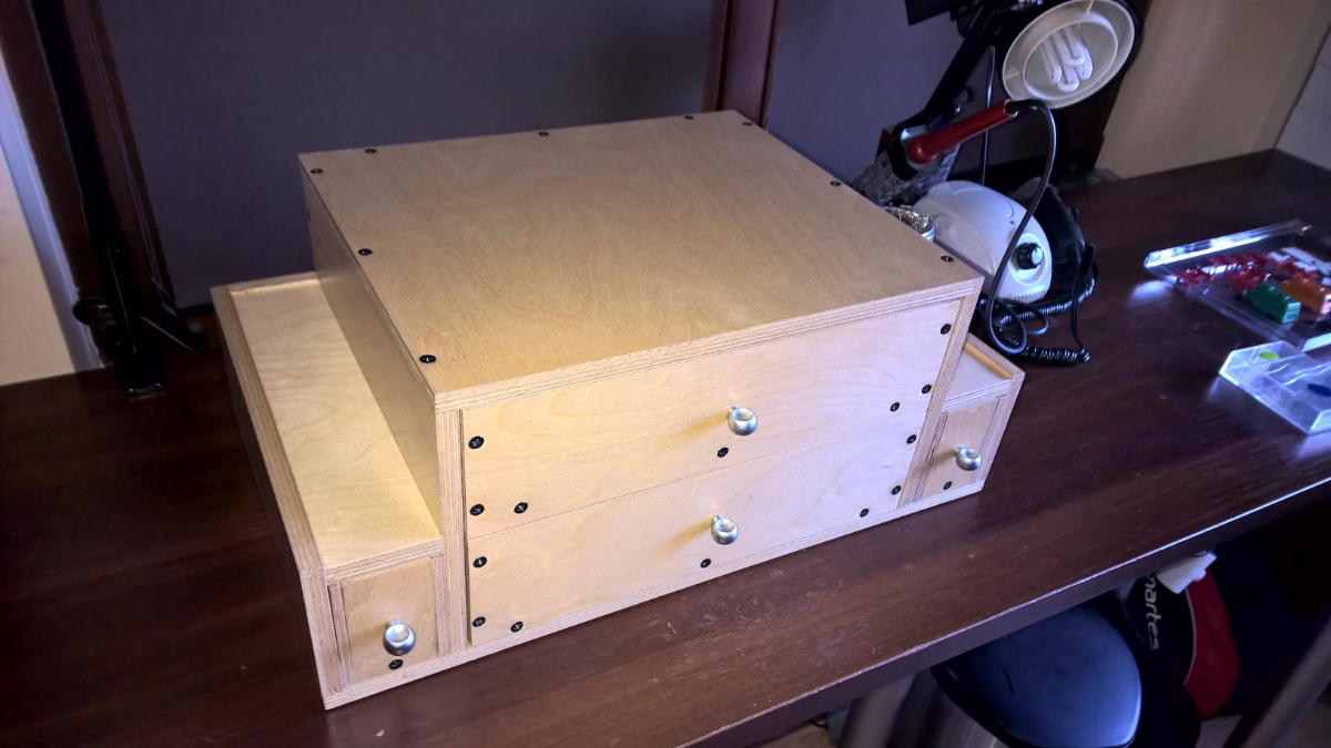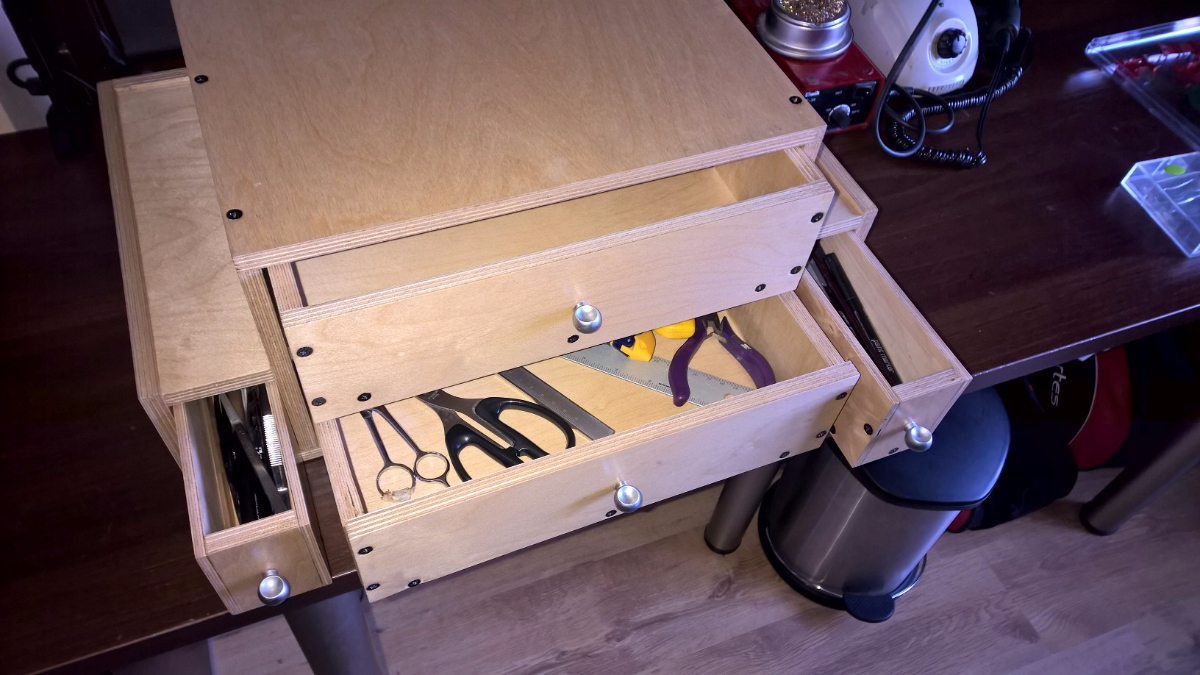 Samo stanowisko to swego rodzaju piramida. Pok każdej ze stron wspieramy łokcie na stole. Stanowisko ma dwie duże szuflady mieszczące cały sprzęt tj. stację lutowniczą (Elwik w moim przypadku), mikroszlifierkę, itd. Zmieści też całe arkusze blach.