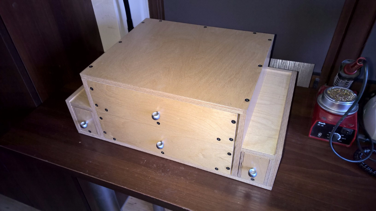Projekt powstał w 3D więc jest dokładny i składalny. Do jego budowy użyłem sklejki 12mm i 6mm. Całość poskręcałem kontrastowymi czarnymi wkrętami i wylakierowałem lakierem akrylowym wodnym. Lakier dwa razy (w środku też). Potem szlif na gładko i kolejna warstwa lakieru.
