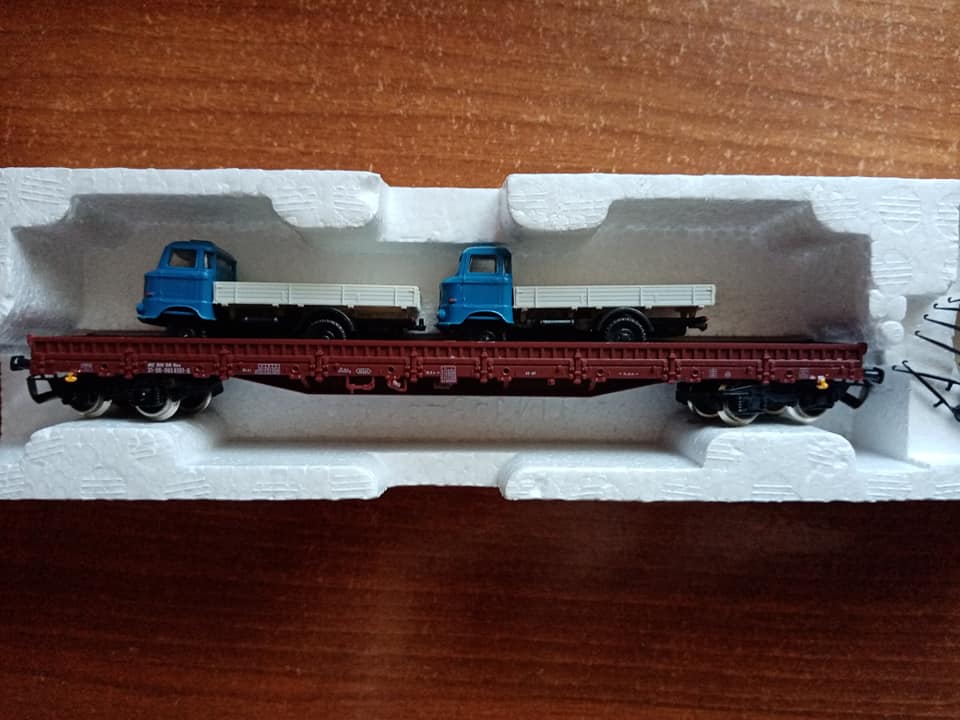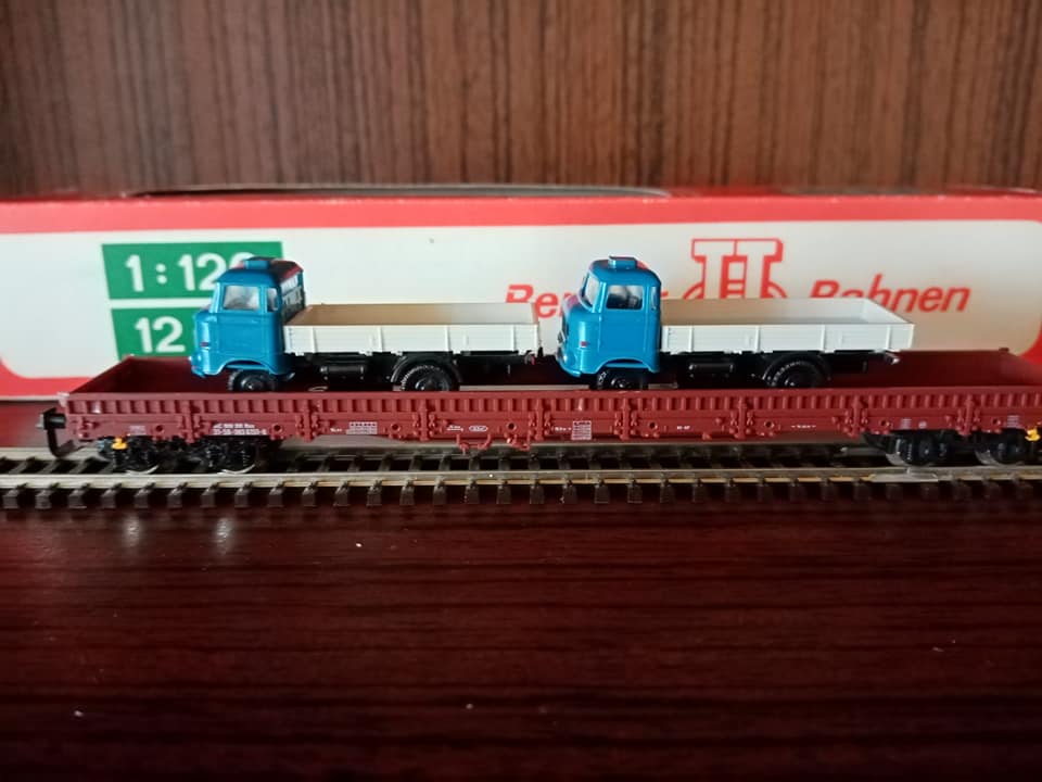 "Dla tych co lubią końcówkę BTTB. Udało mi się upolować brakujące ostatnie ogniwo do kompletu wagonów REKO starej konstrukcji. Nr kat 13750 kończy zbieranie tych sympatycznych wagonów DR. I platforma długa z ciężarówkami nr kat 15520 to była ciekawa nowość katalogu 90/91 formatu akademickiego."