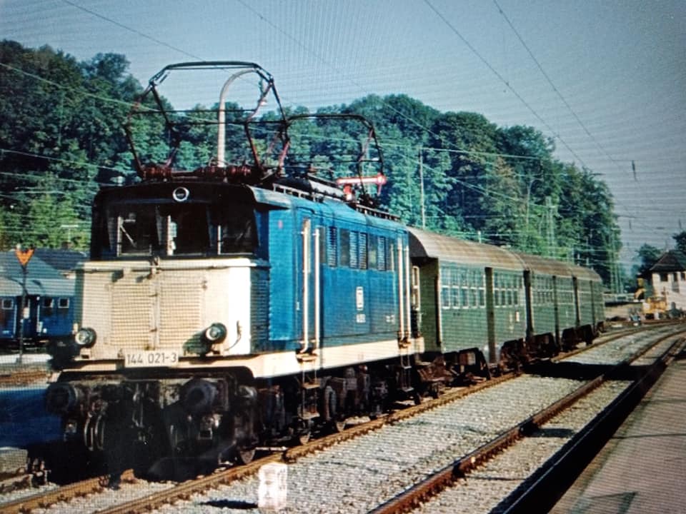 "Druga część z serii model i oryginał. Do opisanego kiedyś modelu serii 144 021 doszły z internetu nowe foki. Stary Tillig czyli pierwsza wersja E44 nr kat 02425 na szlaku. Epoka czwarta. Zdjęcia pochodzą z 1983r."