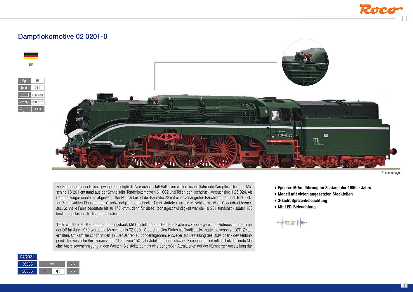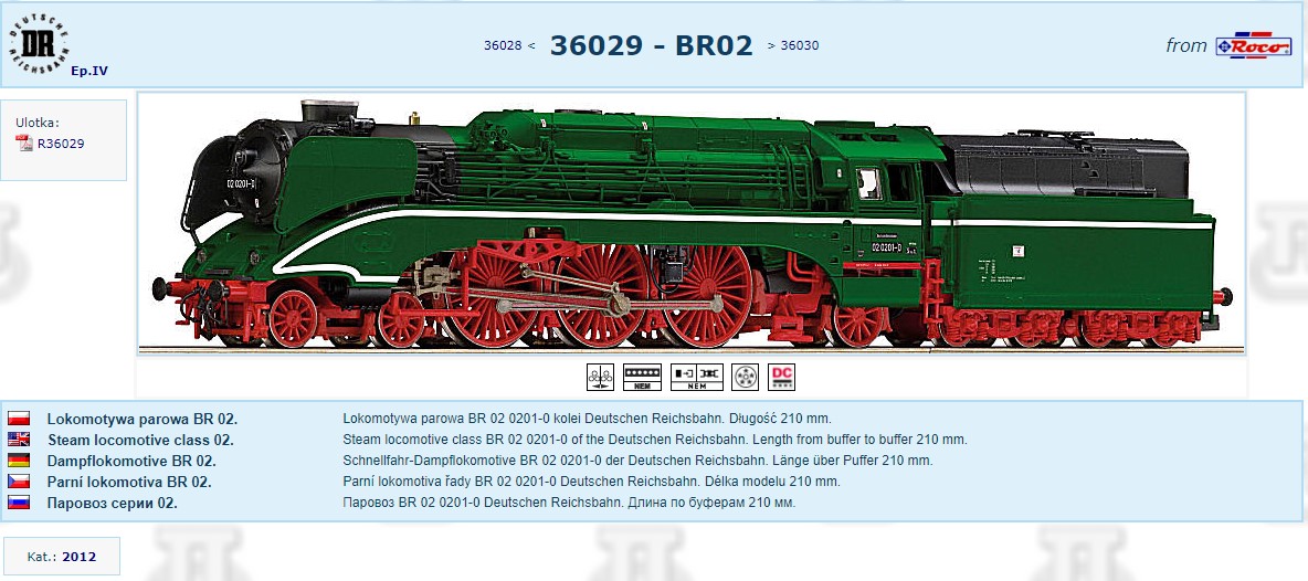Po przebudowie jako 18 201 maszyna miała w 1961r tender węglowy. W 1967r już opalanie na olej. Z racji dużych prędkości testowała składy produkowane na 160km/h. W czwartej epoce otrzymała oznaczenie 02 201. Właśnie w tej wersji podoba mi się najbardziej. Oprócz tego można było spotkać tą maszynę w pociągach specjalnych jak też w planie parowozów 01 z planowymi składami. Odpowiedniki Roco 36029/30 jak i po wznowieniu produkcji w TT czyli 36035/36036"[/i]