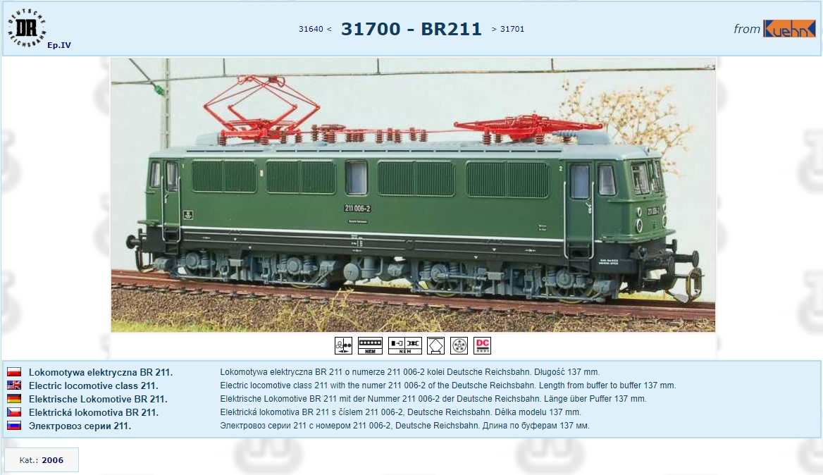 "Model w katalogu i oryginał. Firmy Kuehn seria 211 006 i oryginał na trasie z pociągiem międzynarodowym z Berlina do Pragi. Ostatnia fotka to obraz loki a właściwie miazgi po spotkaniu z..... czołgiem. Wyprodukowana w 1962r a kasacja po wypadku w 1988r. Ten model Kuehna pamiętam fajnie się prezentował na wystawie jako nowość w nieistniejącym już sklepie Technohobby w Gdyni."