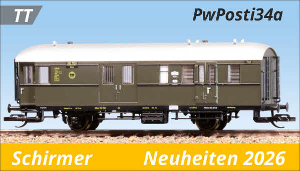 "Często zamawiany i ponownie produkowany – wagon bagażowo-pocztowy PwPosti34a dla skali TT. Wszystkie trzy warianty można już zamawiać w przedsprzedaży. Według Schirmera dostawa powinna nastąpić wkrótce."