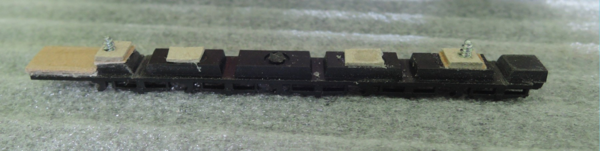 Nie zaryzykowałem prawdziwego prostowania ramy, ale skompensowałem położenie wszystkich 5 osi poprzez podłożenie pod ślizgi kawałków tektury. Pod osie nr 1 i 5 – ok. 0,8mm, a pod osie nr 2 i 4 – ok. 0,4mm. Podobne grubości nakleiłem na dolną listwę, aby podczas dokręcania nie wyginała się do kształtu krzywej ramy i nie blokowała kół. W tej dolnej listwie musiałem też lekko podpiłować szerokość rowka na oś 1 i 5, bo nie wypadały w jednej linii z krzywą ramą.