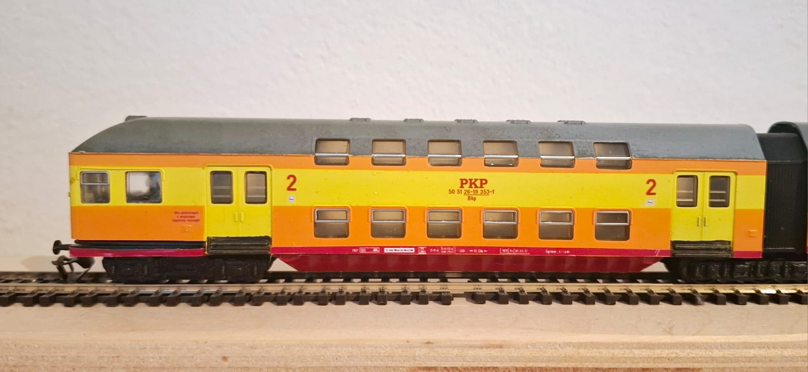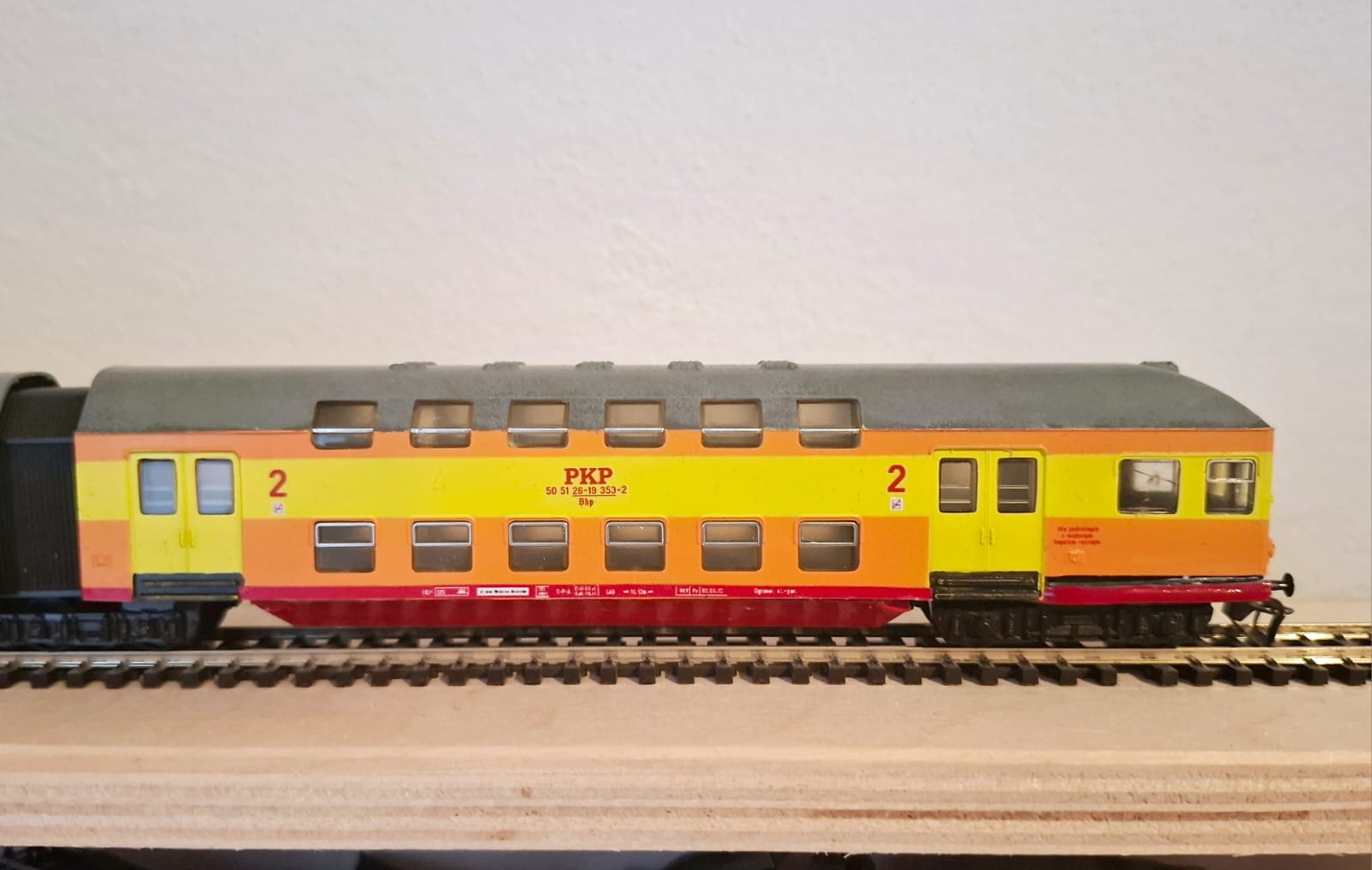 Na targu wpadł mi pkp za 30. Niestety ze zniszczonym malowaniem. Skretopyski do poprawy. Wagon pisanka jak to u mnie. Te czoła pomarańczowe nie pasowały mi do tego wynalazku