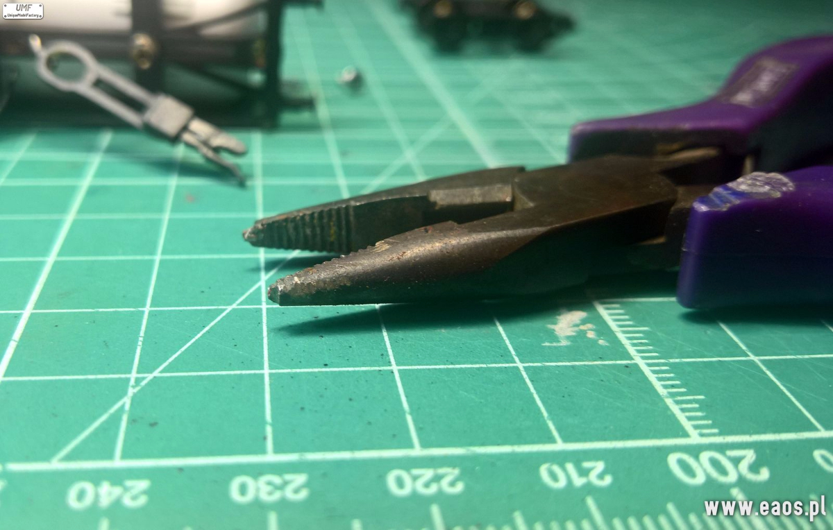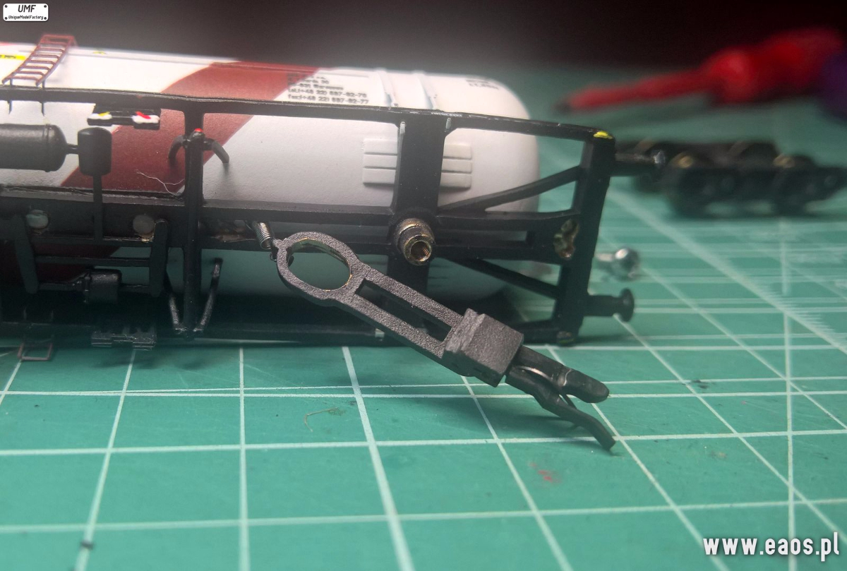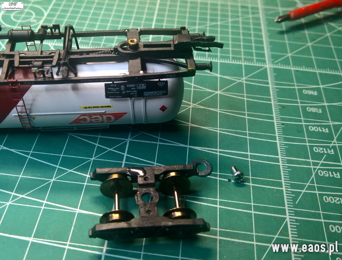 Będzie potrzebny śrubokręt i kombinerki z zaokrąglonymi szczypcami. Śrubokrętem odkręcamy wózek Wyciągamy dyszel, bez odpinania sprężynki. Otwór ma kształt fasolki. To on jest problemem bo niekiedy jest za ciasny. Używając kombinerek zmienimy jego kształt. Wystarczy włożyć kombinerki do środka i delikatnie przekręcić je w jedną i druga stronę. W ten sposób uzyskamy mniej owalny kształt i dyszel będzie miał więcej luzu na czopie skrętnym wózka. Wkładamy dyszel, potem podkładkę (od strony pomostu podkładkę na wózek) i skręcamy. KKS już działa poprawnie. Szymon zaproponował rozpiłowanie tego otwory ale nie ma co brudzić modelu opiłkami lub ściągać sprężyny.