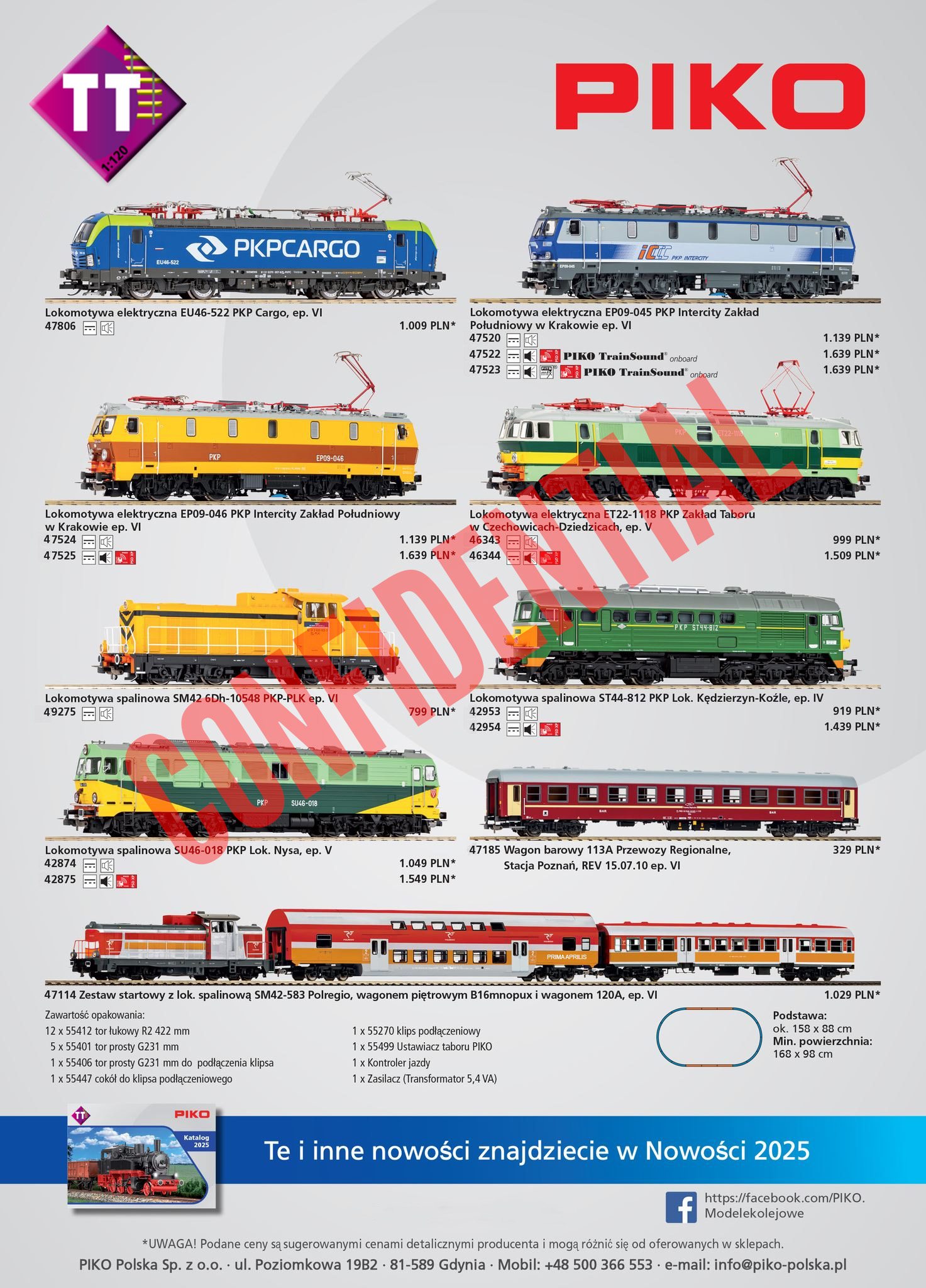 Trochę ryzykuję publikacją prospektu z oznaczeniem "tajne" - w razie co proszę moderatora o usunięcie. W każdym razie, wyciekła lista kolejnych nowości PIKO w skali TT. Z informacji które do mnie dotarły wynika, że pierwsze nowości mają się pojawić w sklepach 31 czerwca tego roku.