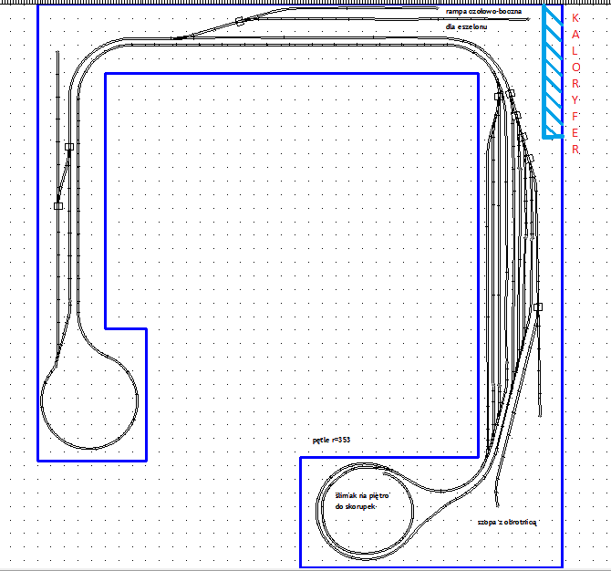 Pomysł jest taki, jak na załączonym obrazku. Z pętli po prawej ślimakiem na pięterko do ''skorupek''(stacja z mijanką na jednotorze 50x330cm), przed lewą pętlą jakiś zakład produkcyjny,cementownia...kamieniołom..., na wprost bocznica z rampą czołowo boczną dla eszelonu.