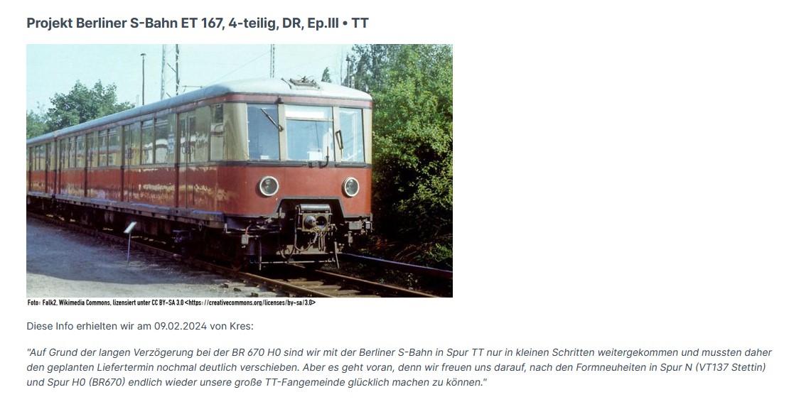 „Ze względu na duże opóźnienie w przypadku BR 670 H0 poczyniliśmy jedynie niewielkie postępy w przypadku berlińskiej kolei miejskiej S-Bahn w wielkości TT i dlatego musieliśmy ponownie znacznie przesunąć planowany termin dostawy. Ale wszystko idzie do przodu (...) aby w końcu ponownie uszczęśliwić naszą liczną rzeszę fanów TT."