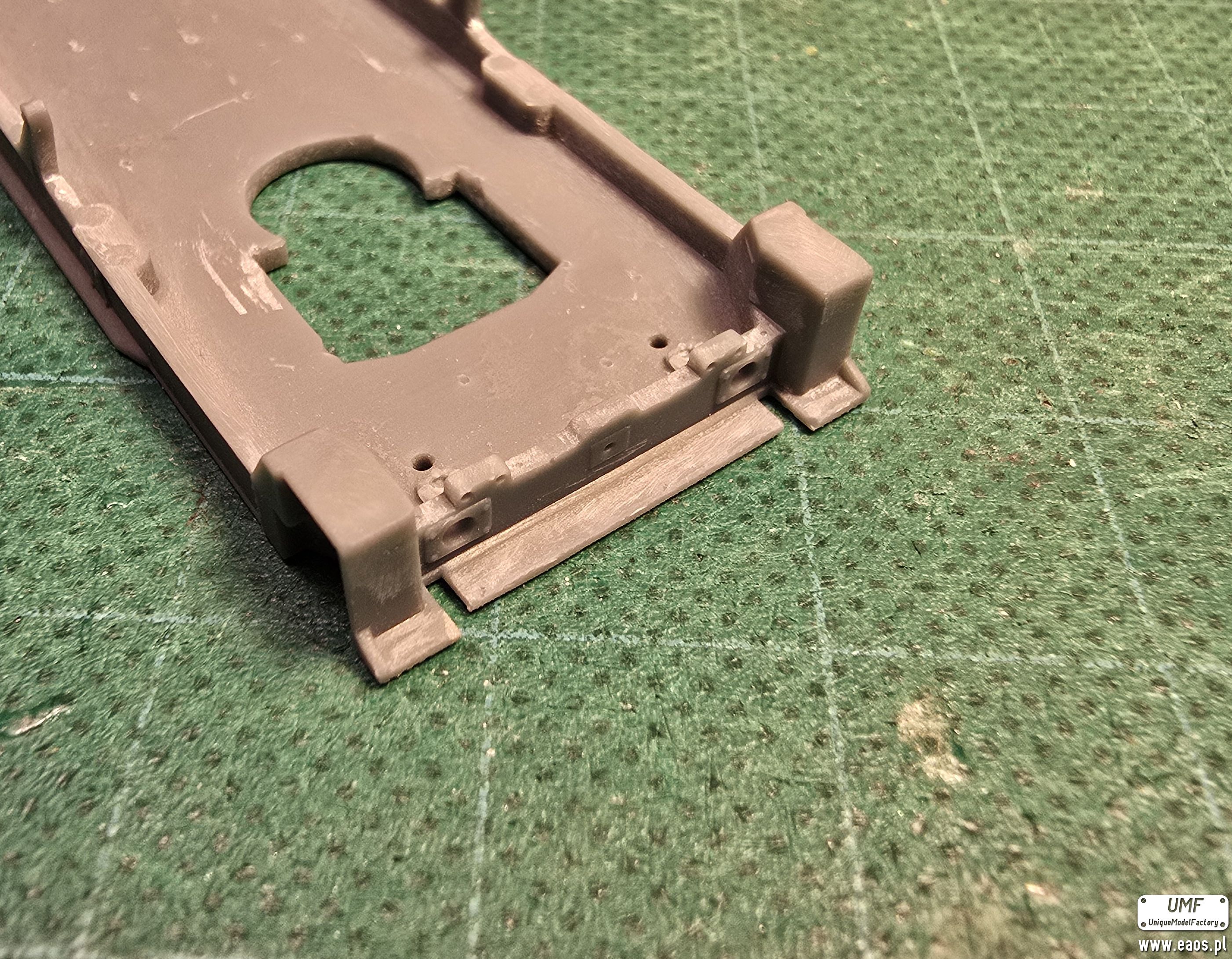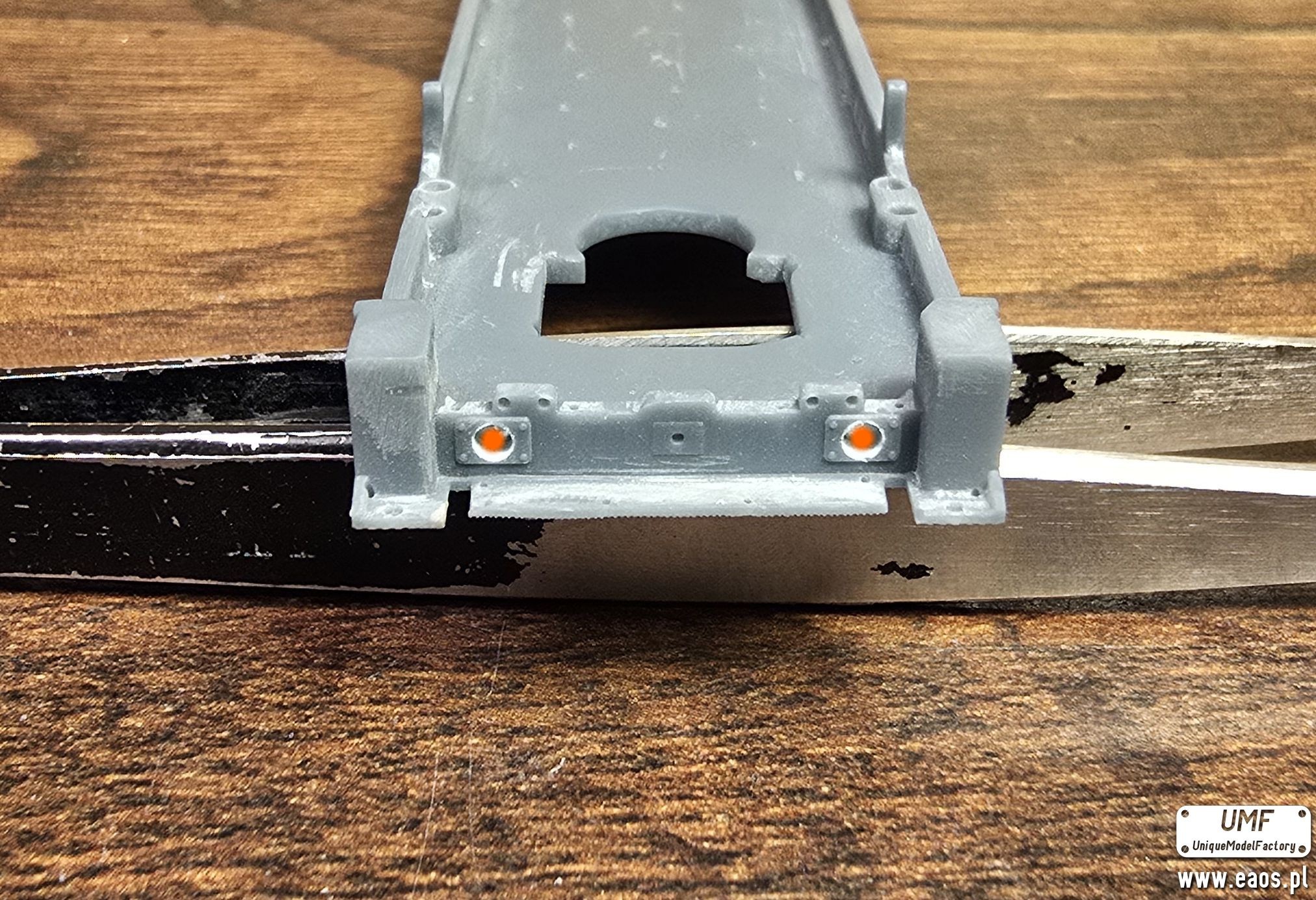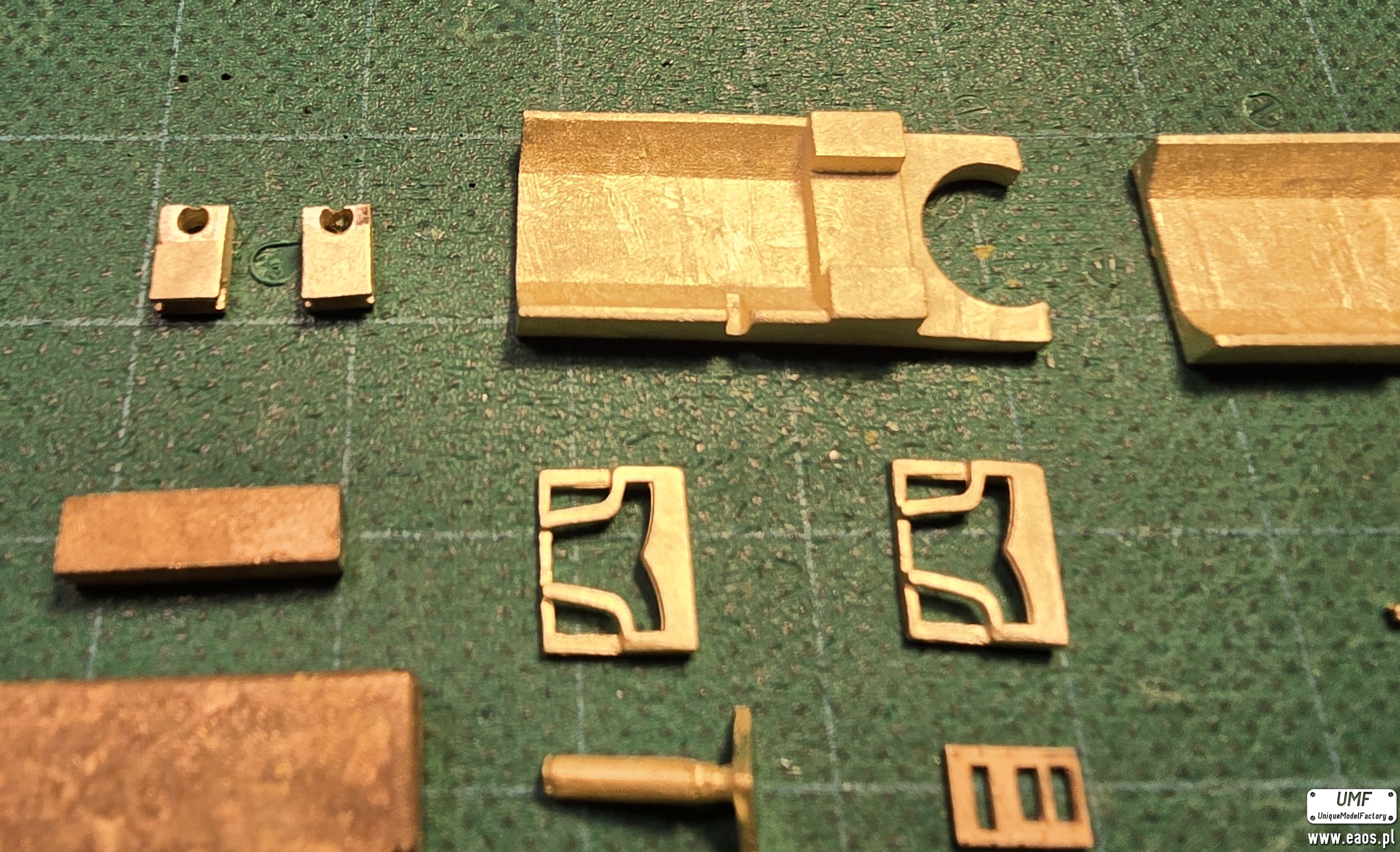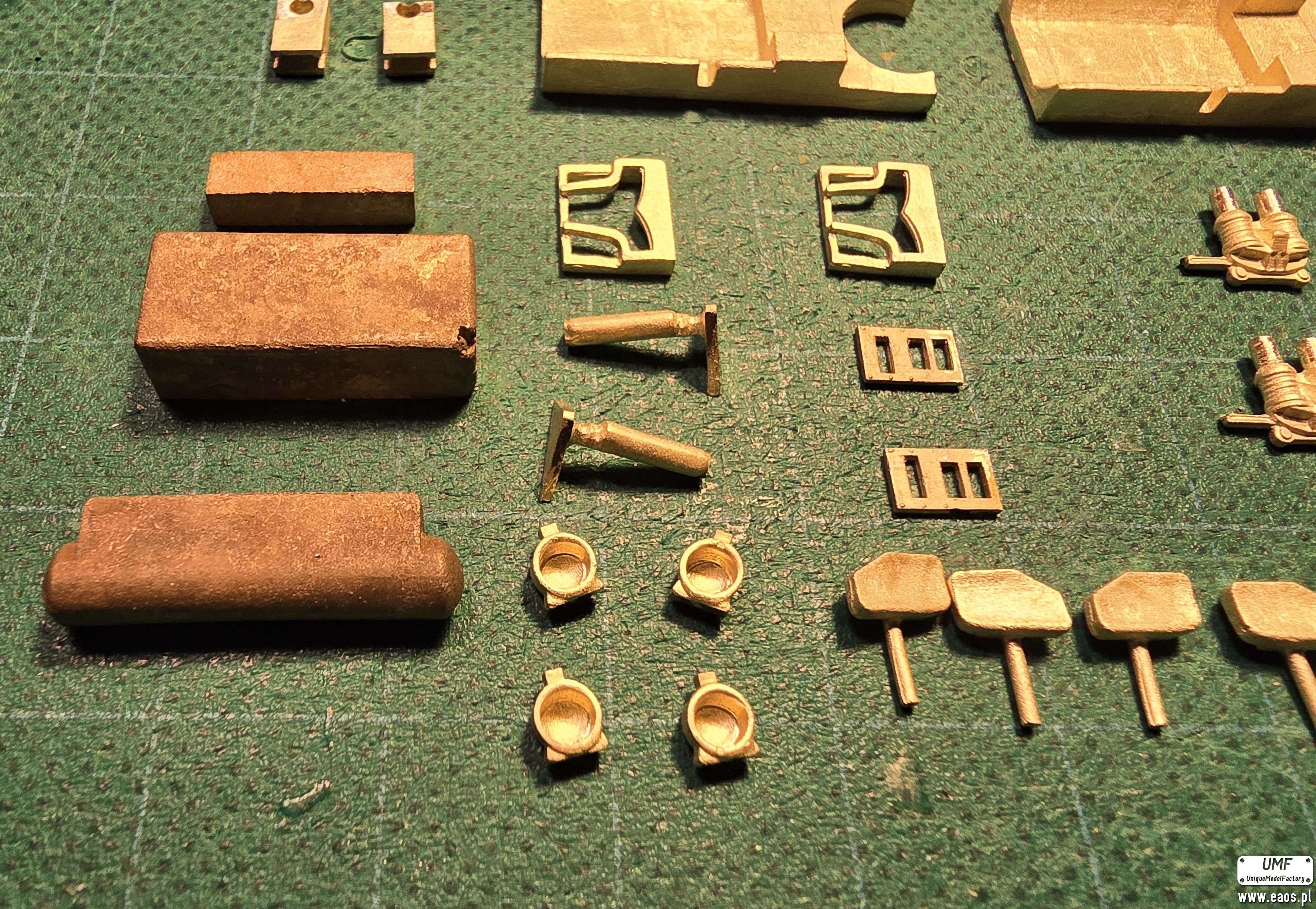 Metalowe odlewy montujemy tak samo jak w przypadku wersji żywicznej z tym, że ja posłuchałem się Wojtka i montuję do malowania tylko sprężyny, schodki, reflektory i podstawy silnika. Reszta po malowaniu bo łatwiej maskować i wszystko ładnie wymalować.