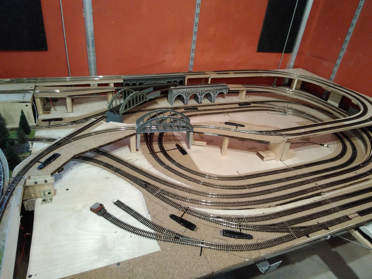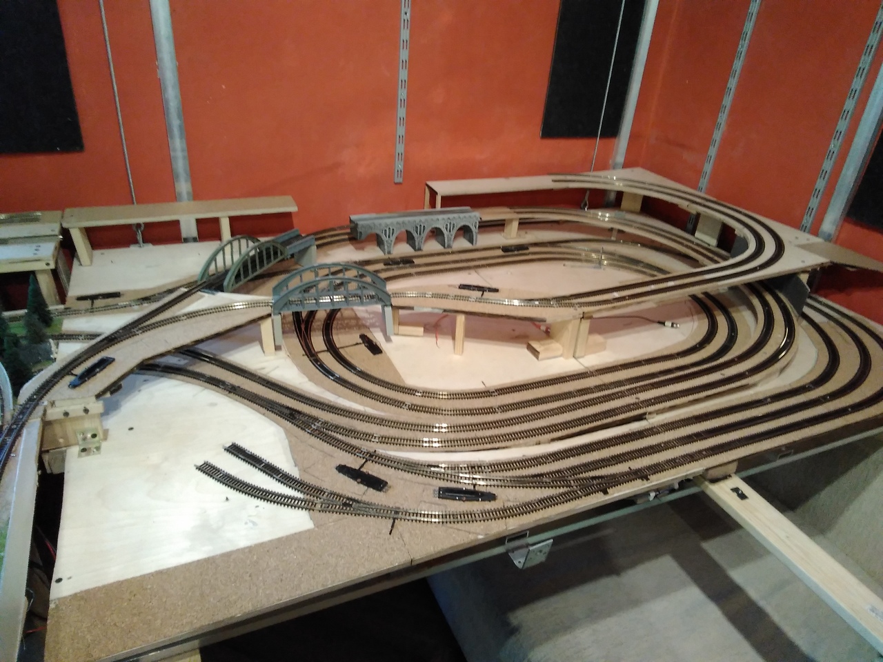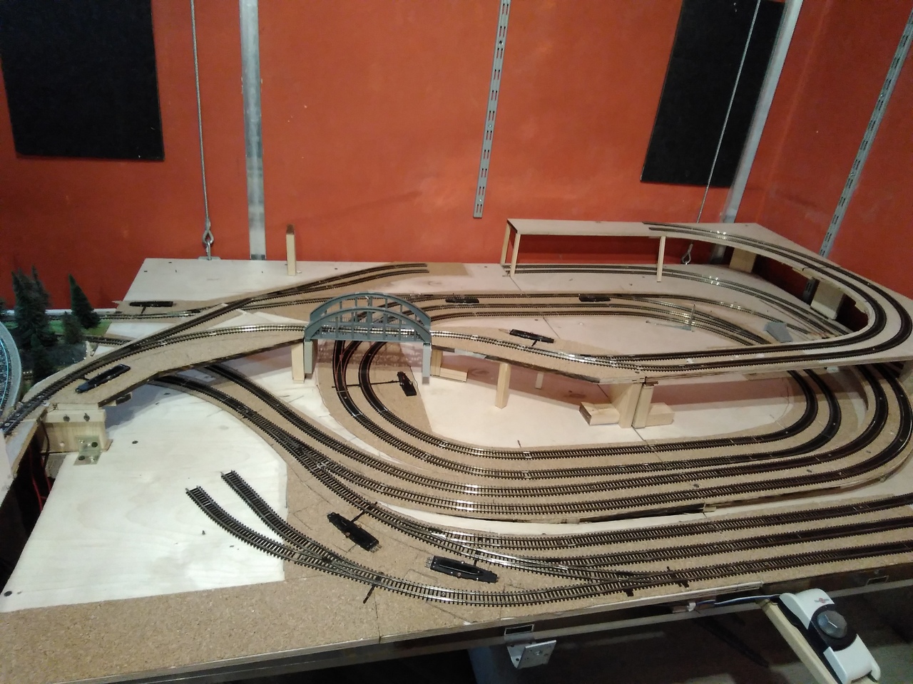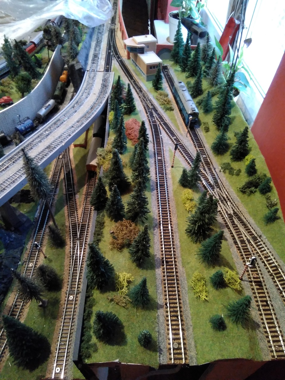 Kolejny dzień przy makiecie. Dziś pierwszy raz przejechał pociąg górnym kręgiem, czyli jeżdżą już dołem i góra ale jeszcze bez przejścia z dołu do góry.