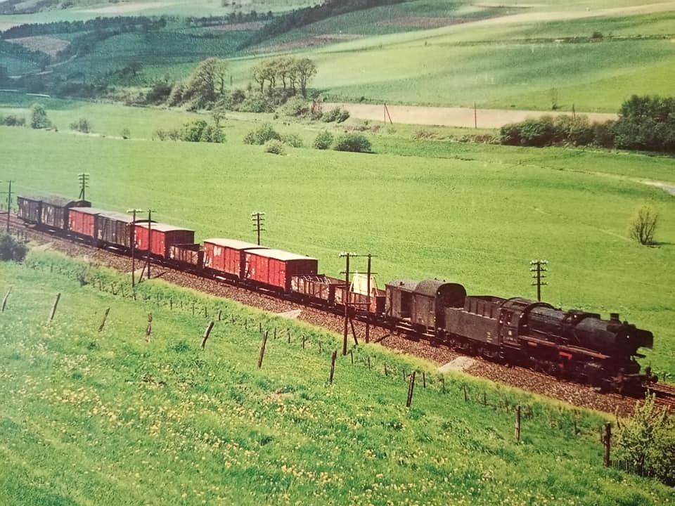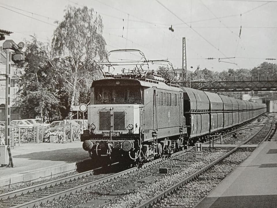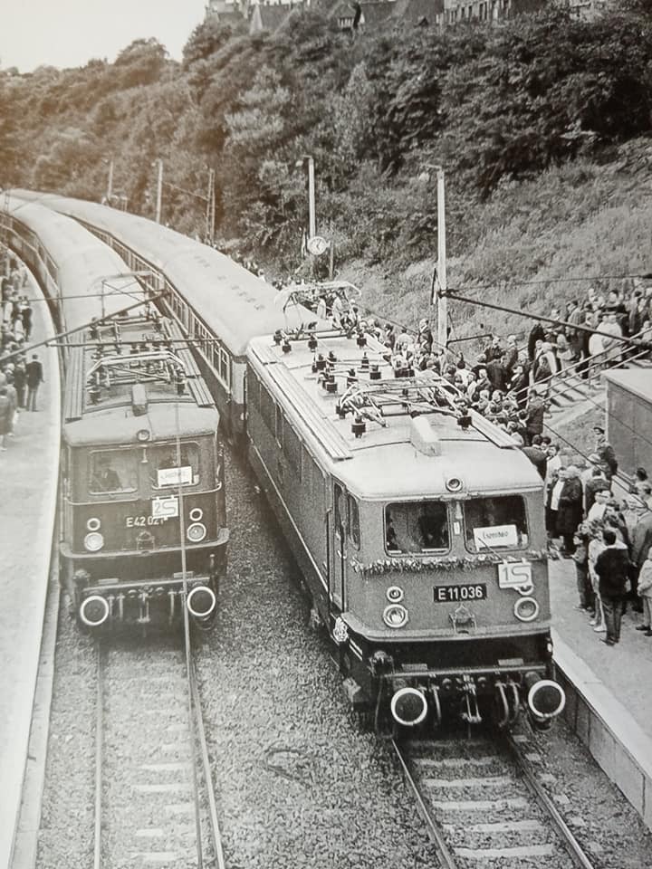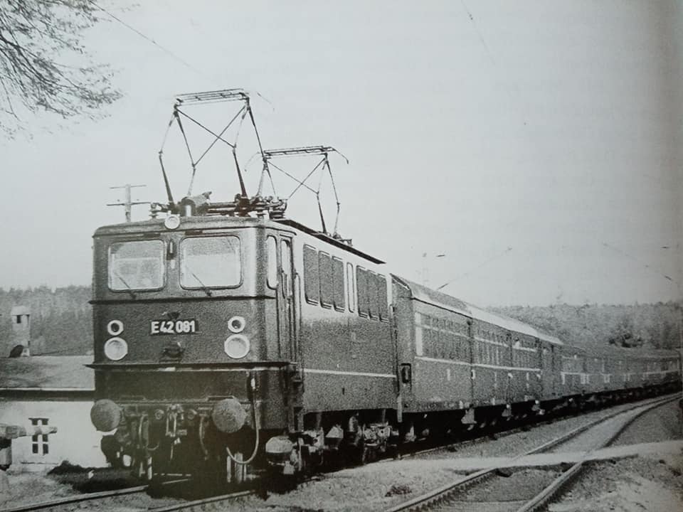 "Końcówka trzeciej epoki. Na DR, podobnie jak na PKP, tłum ludzi w przewozach. Długie składy są nie tylko w pociągach dalekobieżnych, ale i niektórych osobowych na liniach głównych. Kto ma własne auto ten jest gość. E42 z długim składem osobowym ok 15 wagonow typu REKO z Drezna do Zwickau. 1967r."