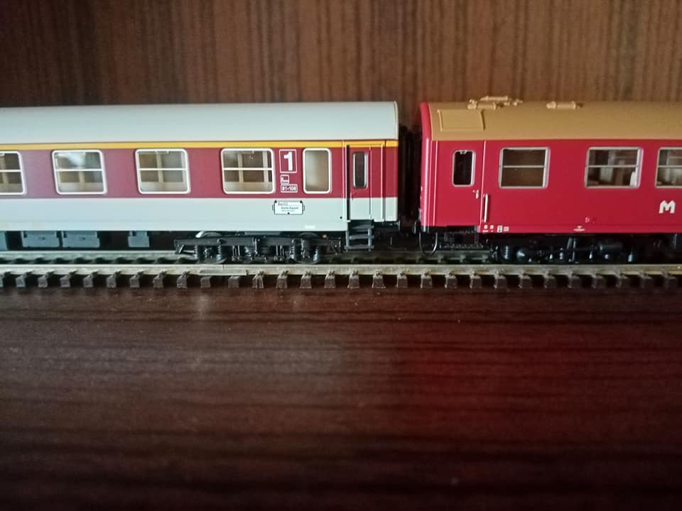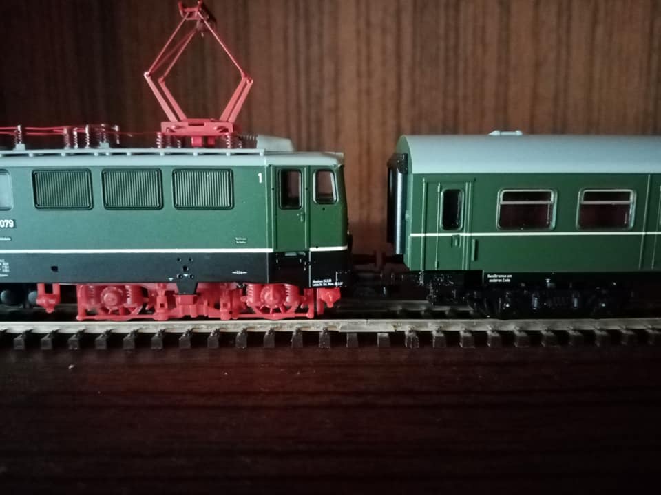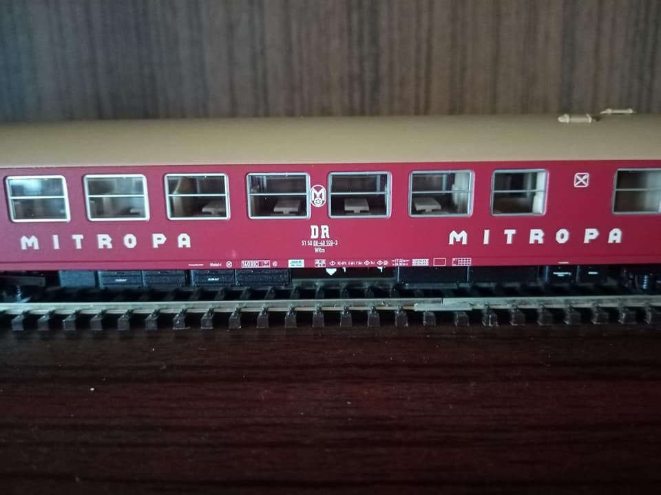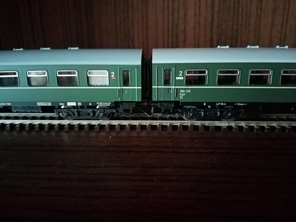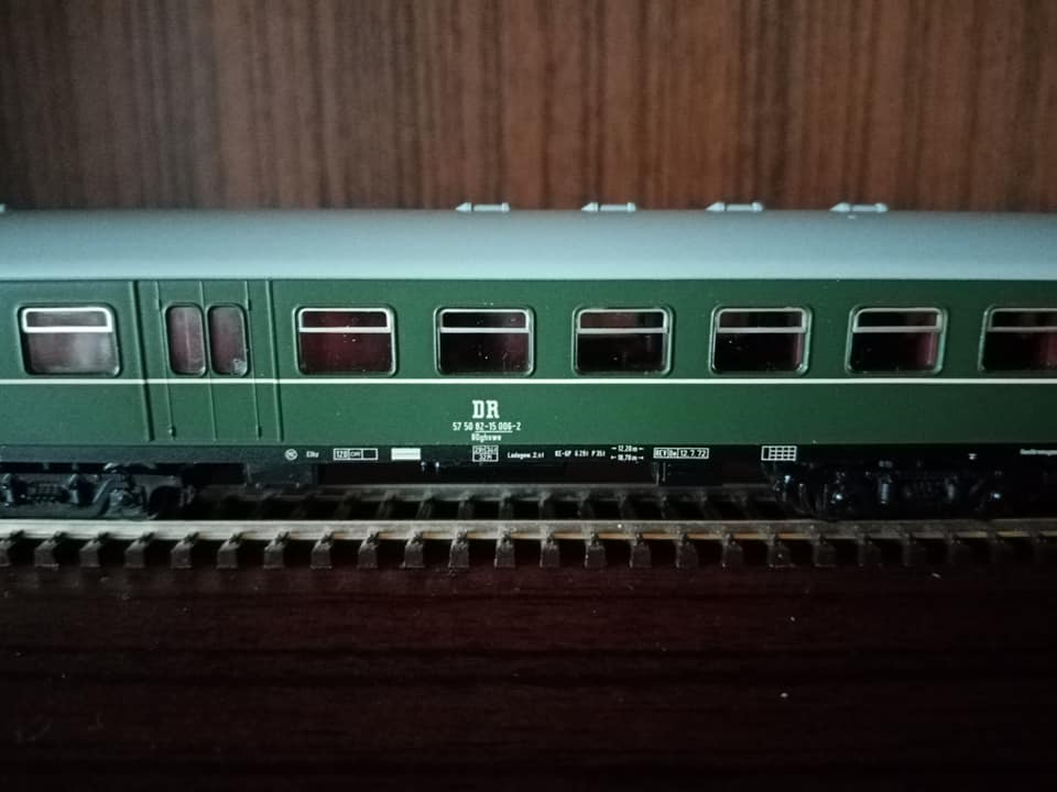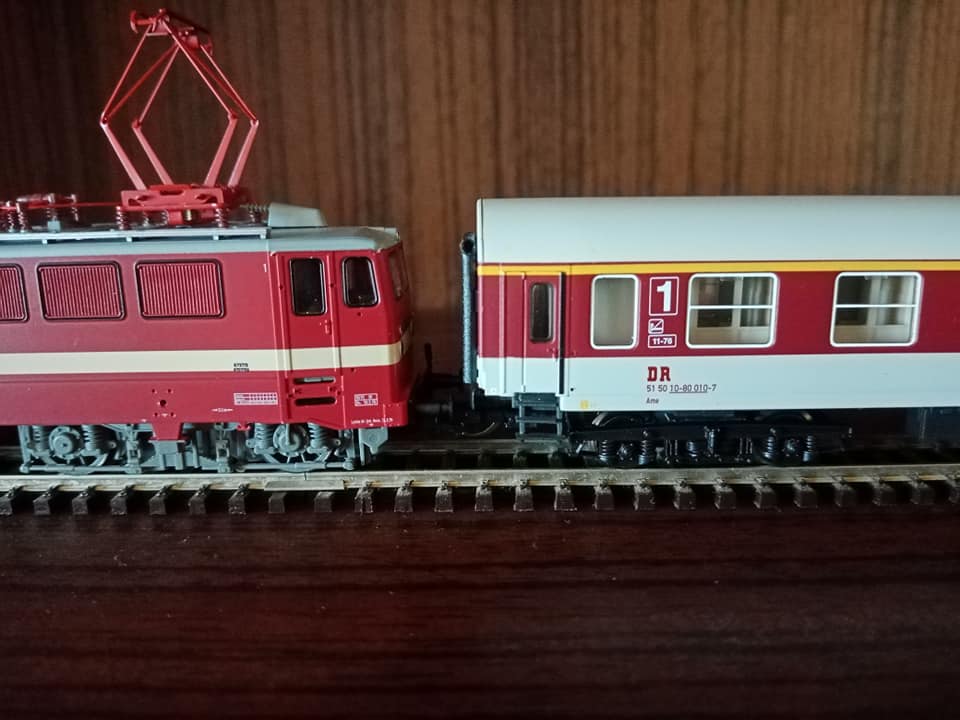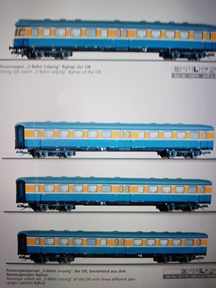 "Dla tych co lubią koleje DR. Mały dodatek do omówionego już udanego setu starszego Tilliga z końca trzeciej epoki czyli właściwie dwuset 01476 i 01477 oraz wagonu dodatkowego 13884. Nowy Tillig po sukcesie starego zrobił kontynuację z wczesnej epoki czwartej. Dla zbieraczy NRD wartość ma. Oryginał w tym malowaniu z wagonami E5 długo nie jeździł. Wytypowane były 3szt elektryków E11 z nr 032/35/36. Później skład został zastąpiony nowszymi piętrowymi wagonami które swego czasu wypuścił Kuehn wraz ze swoją warsja elektryka. Kilka fotek oryginału na trasie i w peronie. Skład przystosowany na ruch zmiennokierunkowy. Miejska kolej Lipska. Już w tamtym okresie w NRD niektóre regiony miały składy osobowe malowane inaczej jak tutaj w Lipsku. Również węzeł kolejowy Halle miał skład piętrowy długi w malowaniu czerwonym który oferował Kress a także znany z końca bttb klasyczna bipa w malowaniu kremowo niebieskim typu Rostock."