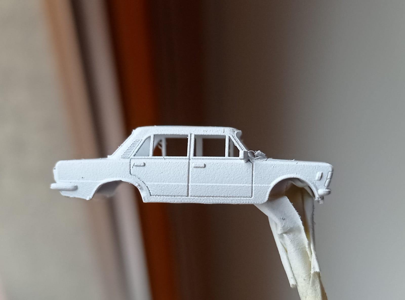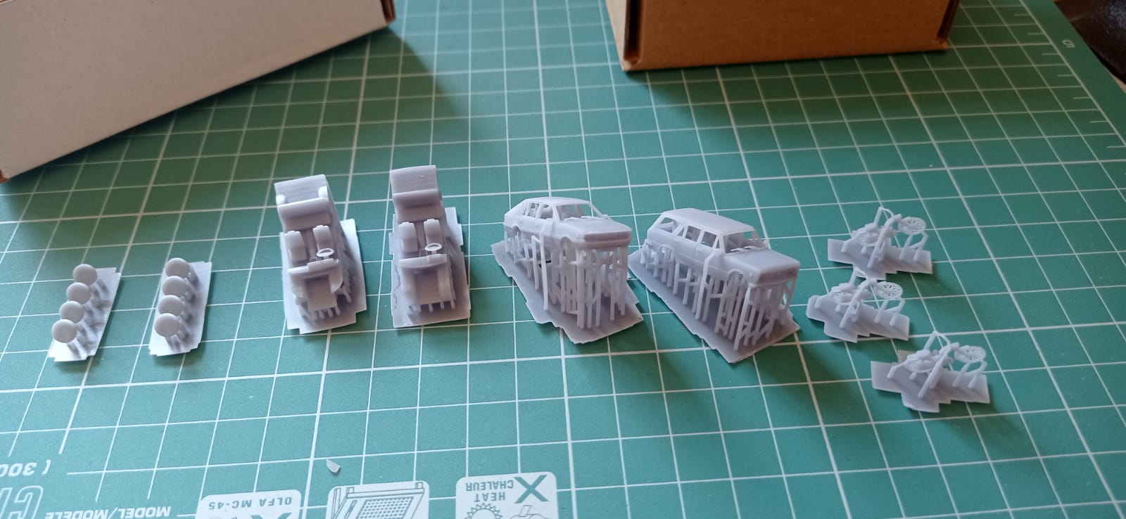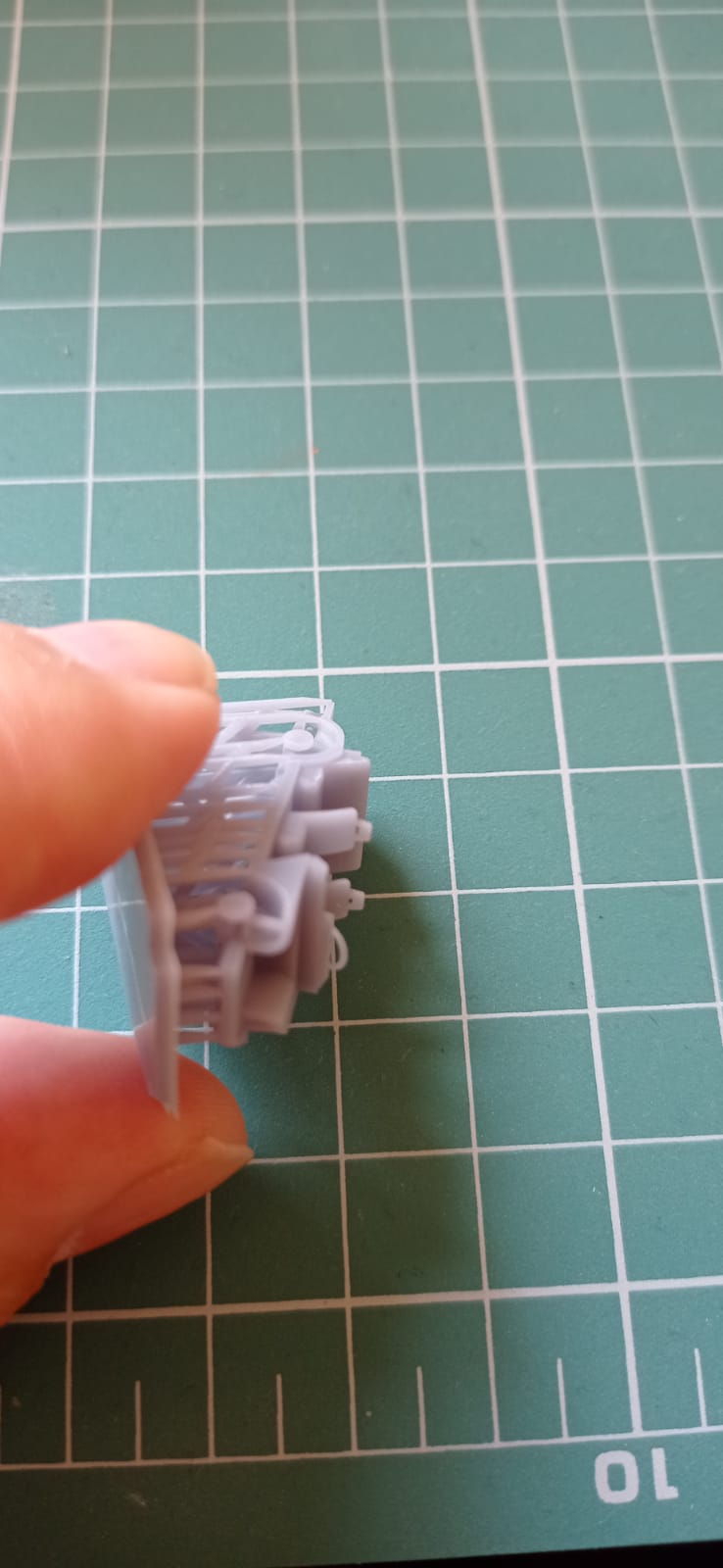 Ostrożnie podchodziłem do lusterek ale bez problemu dały się wyciąć. Model jest bardzo dobrze utwardzony. Wycinanie budy z jednej strony idzie szybko i sprawnie ale z drugiej trzeba odciąć najpierw dół bo jest pod dziwnym kątem i bałem się, że przejadę skalpelem po budzie. Po wycięciu widać raster ale bardzo drobny. Zobaczę jak dostanie podkladem. Powinno przykryć. Podwozie do budy jest dobrze spasowane. Szyby będę próbował po malowaniu wsadzić.