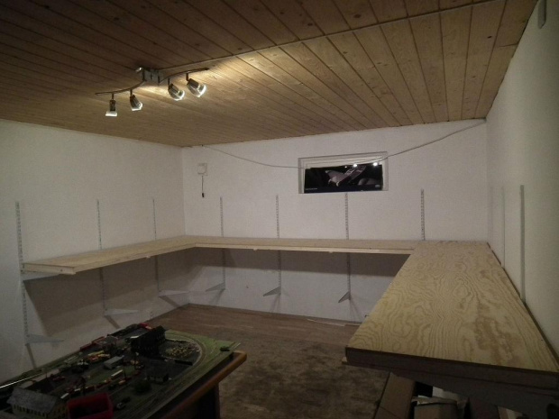 Fajny garaż, drewniany sufit. Dobry pomysł z uchwytami na półki.