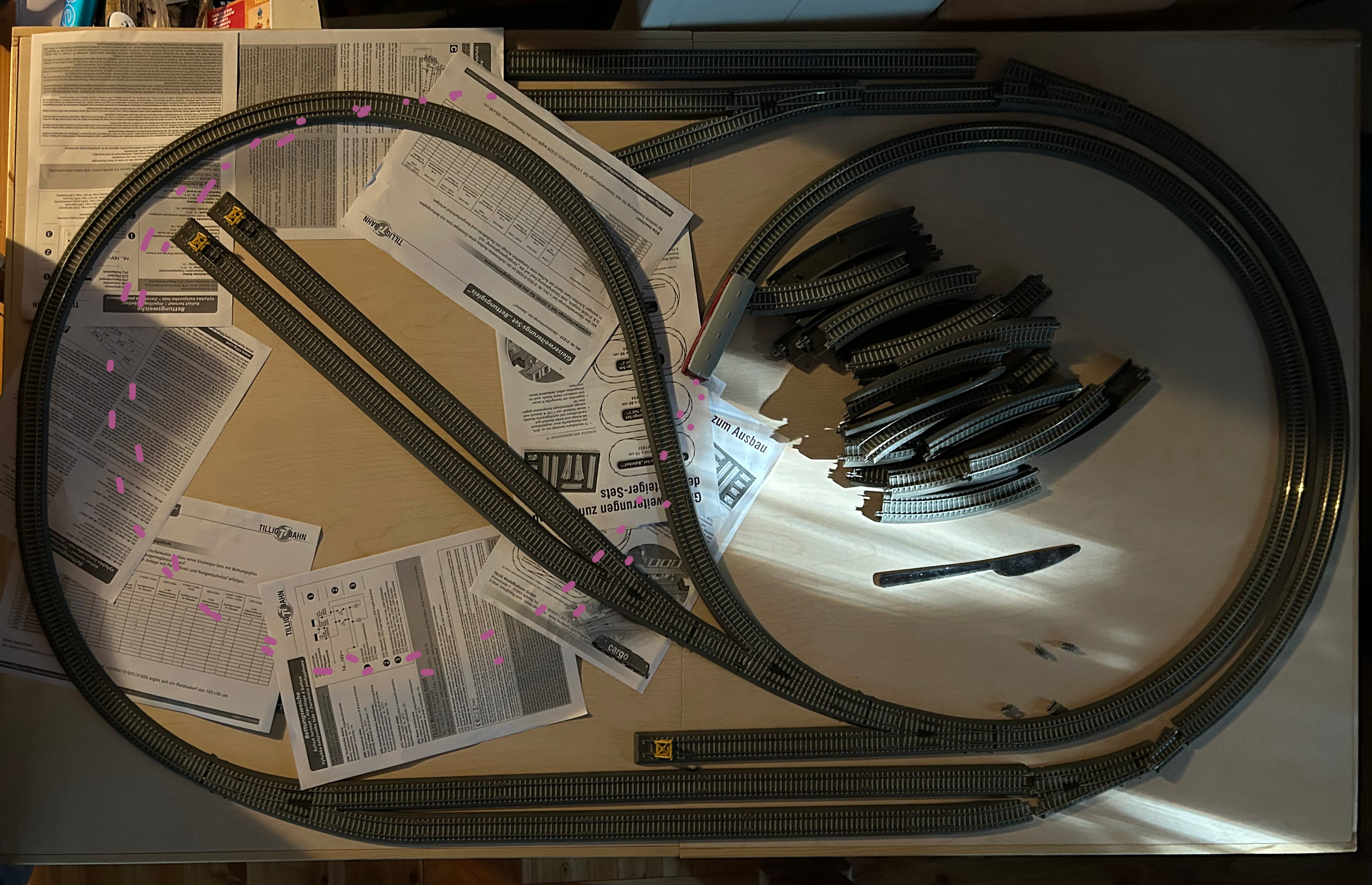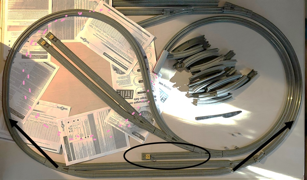 Różowa przerywana linia to główny tor. Te tory obok niego, to bocznice, a a ta zewnętrzna to tor podłączeniowy do kolejnej makiety (kiedyś tam).