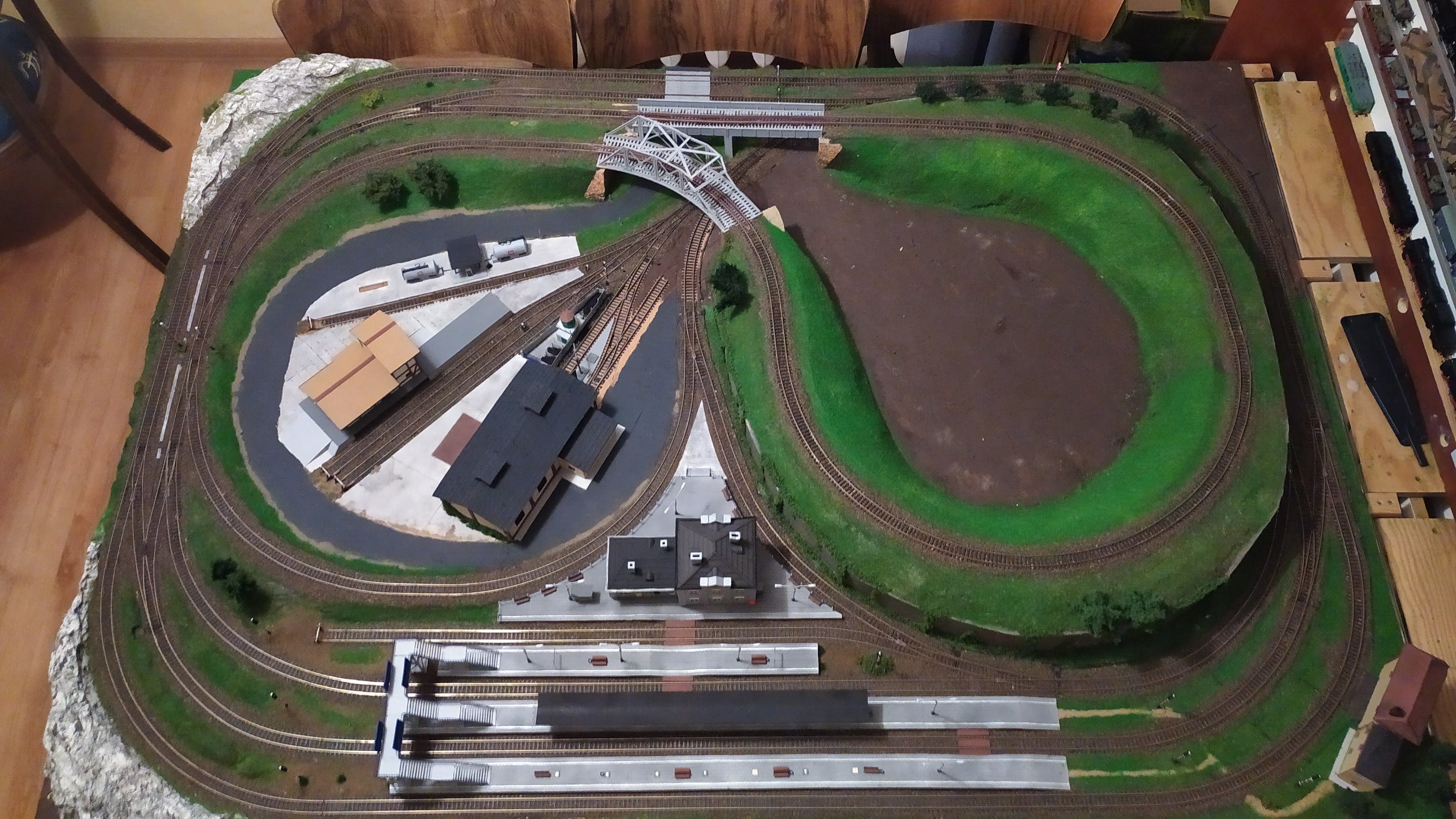 Jeśli chodzi o stację na górze wg mnie bezwzględnie powinieneś rozsunąć rozjazdy i ułożyć je jak najbardziej w łuku - wydłuży to tory stacyjne (szybko znudzi ci się puszczanie lokomotywy z dwoma wagonami osobowymi).