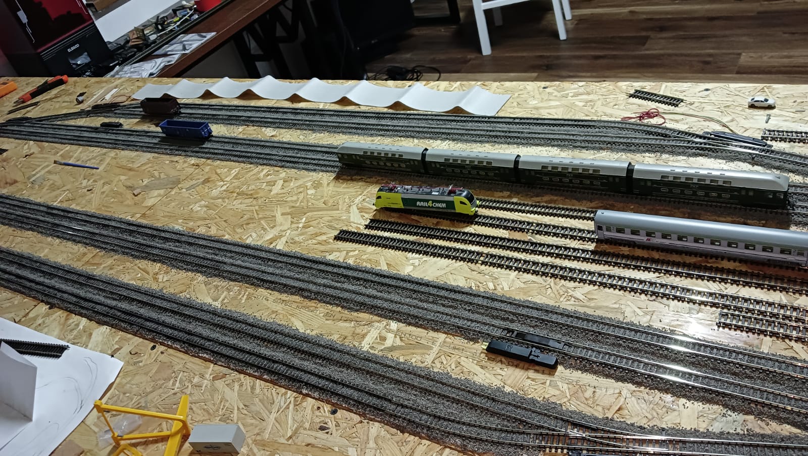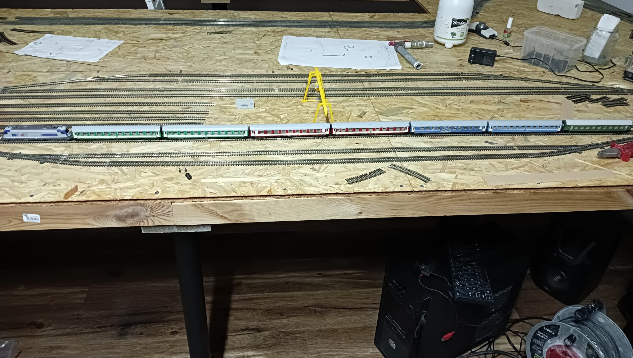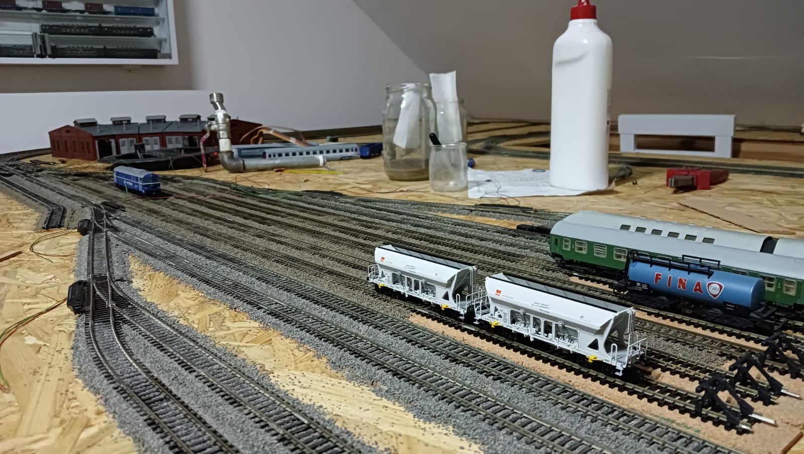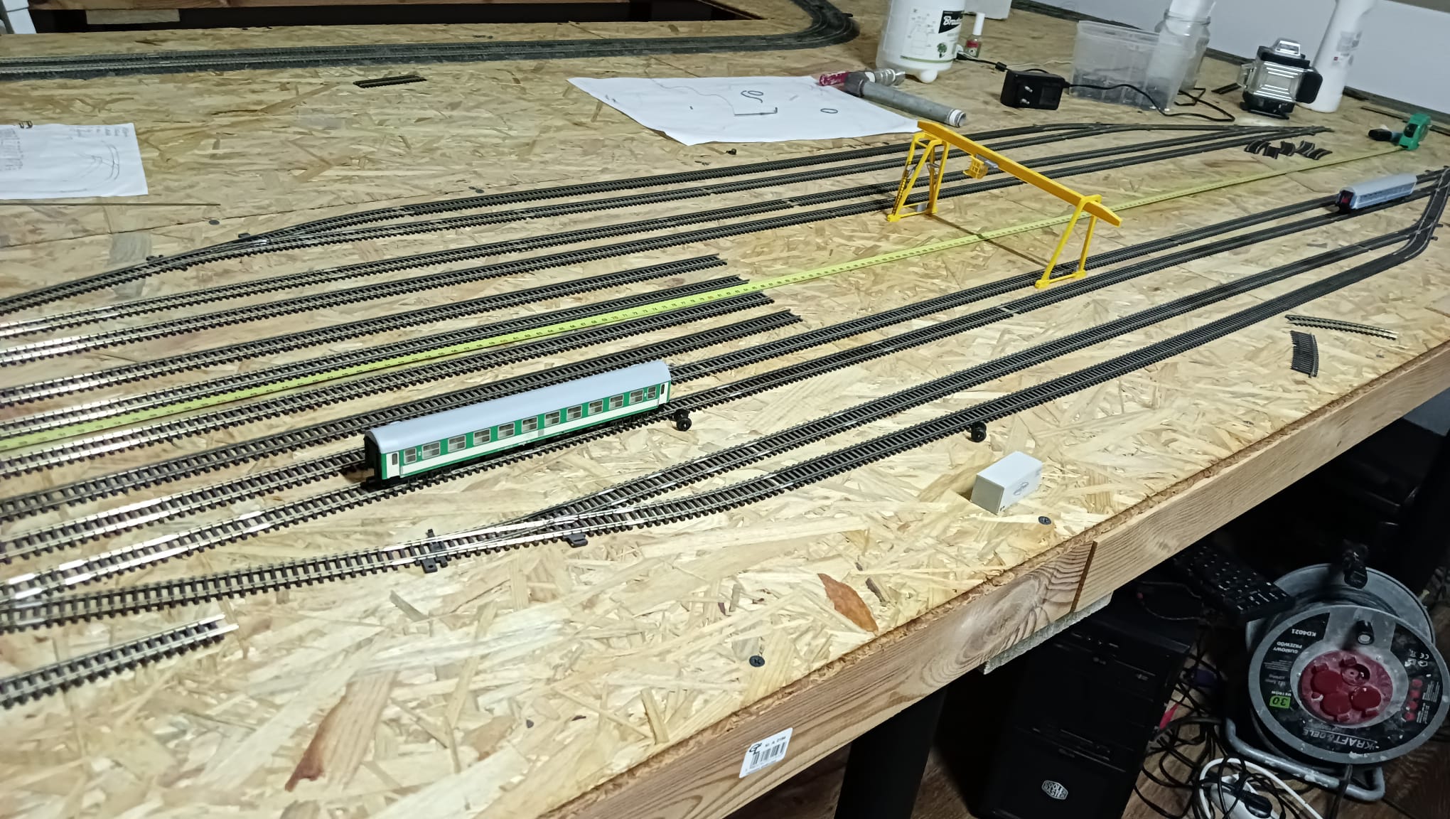 Część północna torów stacyjnych wykonana. Próbne jazdy na dotychczas wykonanych torowiskach lokomotywami 4 i 6 osiowymi przebiegły pomyślnie. Teraz czeka mnie najtrudniejsza część. Węzeł łaczacy wylot torów stacyjnych z postojowymi w kierunku rozgałęzień torów odstawczych(Toruń Kluczyki) torów na 3 bocznice prowadzące do elektrociepłowni, magazynu paliw i olejow oraz centrum przeładunku towarów i paczek. Po drodze jest jeszcze lokomotywownia.