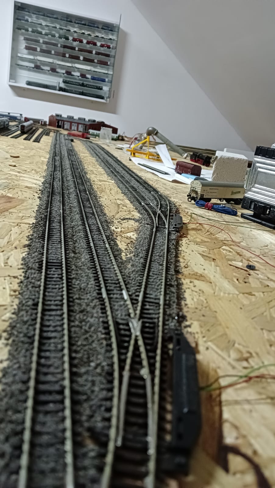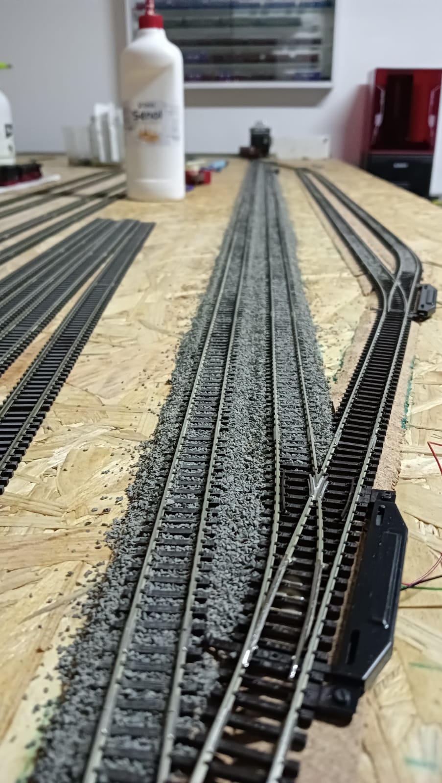 Jak skończę szutrowac całą makietę zajmę się wyznaczaniem punktów elektrycznych pod semafory, lampy peronowe, rozprzegacze, napędy rozjazdów i magistralę zasilania wzdłuż torów. Powierce sobie trochę dziur.