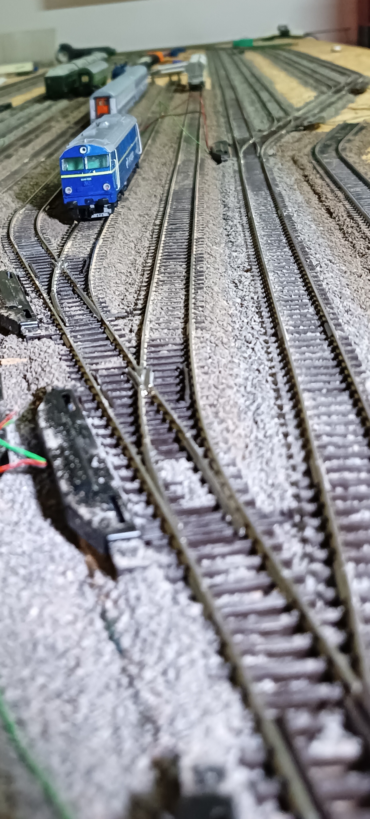 Jak kładziesz tory proste, to użyj jakiegoś przyrządu do tego, by były proste. Wystarczy długa metalowa linijka lub kątownik lub ceownik lub... Tory łamią Ci się na wyjściu z rozjazdów, raz w jedną, raz w drugą stronę. Widać to nawet na przybliżeniu, a skoro z tej strony robiłeś zdjęcie, to pewnie będzie można oglądać makietę z tej strony i będzie to wyraźnie widać.