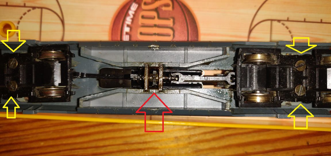 Aby zdjąć wózki to wyjąć zawleczki. Aby rozebrać wózki to zapewne odkręcić te śrubki, nie znam tej lokomotywy. Uważaj na wszelkie plastykowe zatrzaski, stary plastyk lubi pękać (nie jest tak elastyczny, jak nowy).