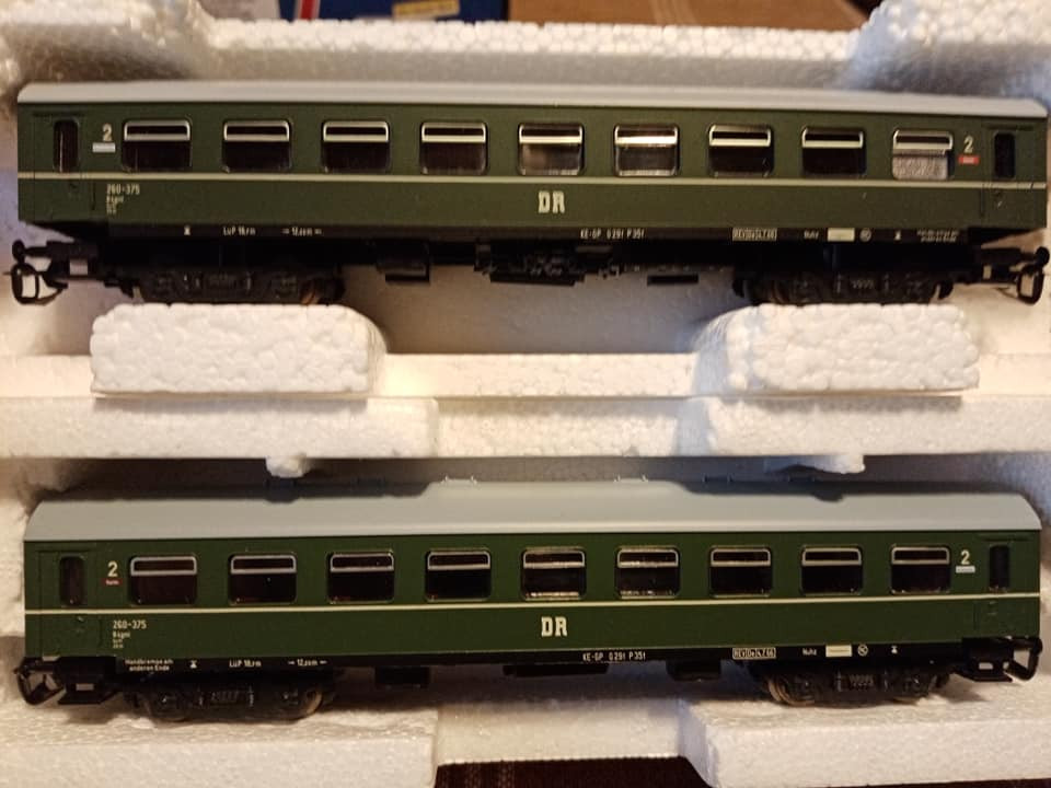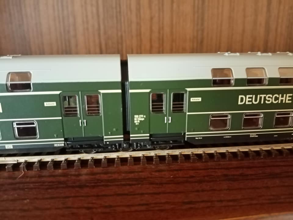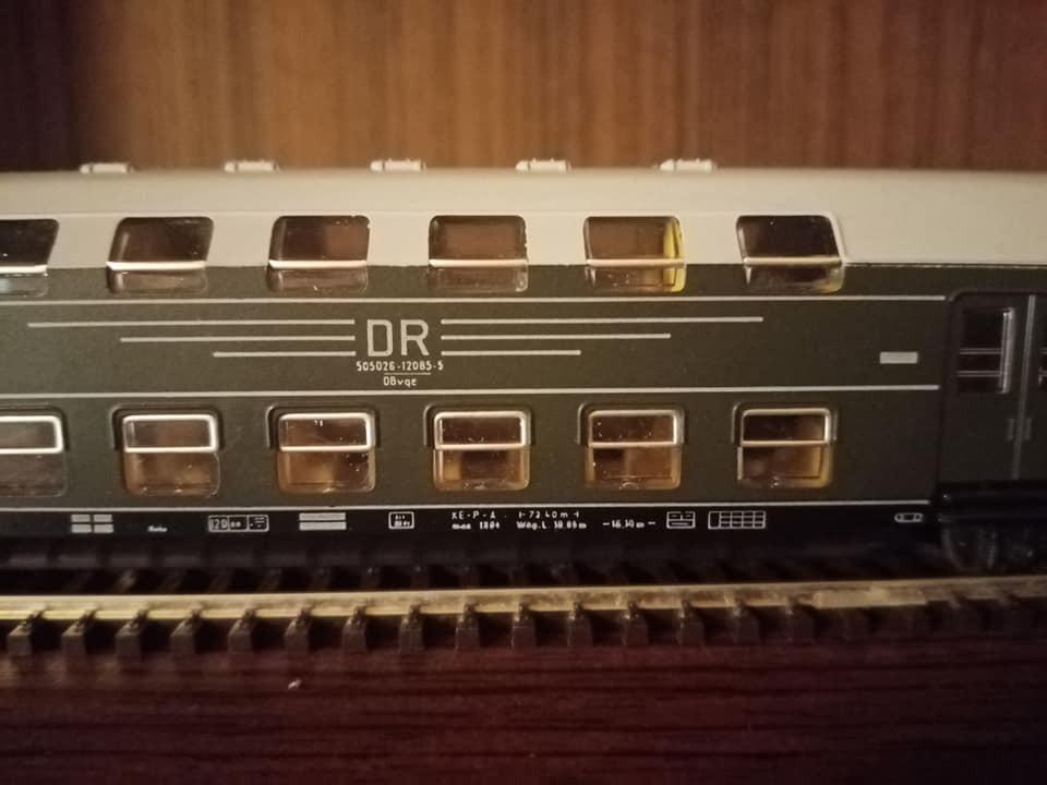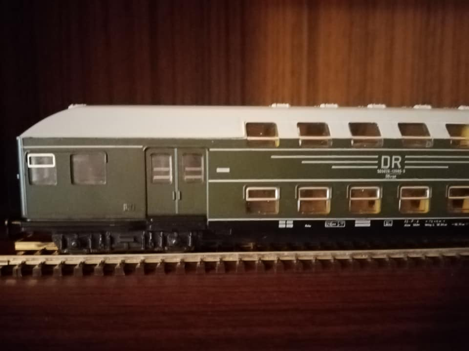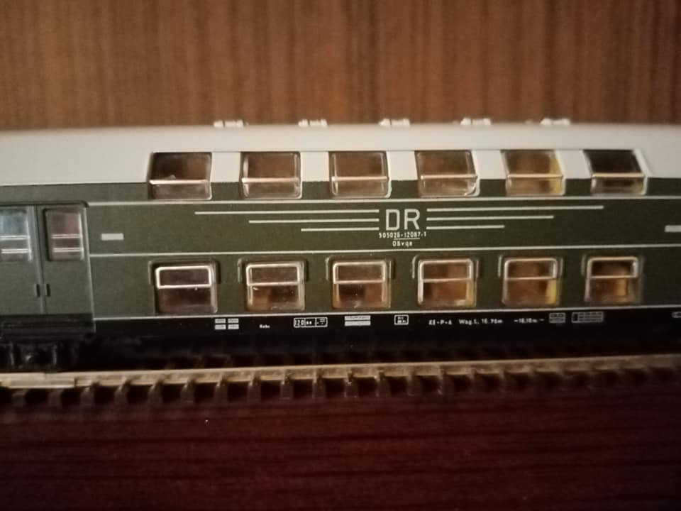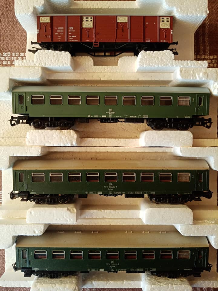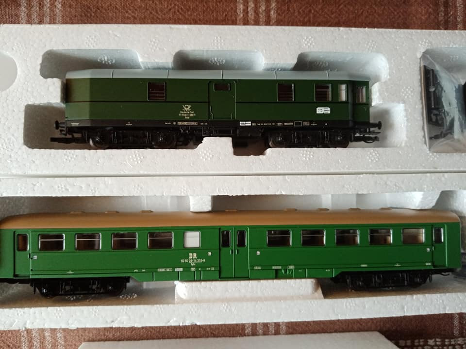 "Dziś pojedzie nietypowy skład i rzadki, ale jak na czwartą epokę przystało to charakterystyczny i planowy. Odpowiednik lopka PKP czyli w NRD typu Gex jako pocztowy z przesyłkami. Na makietę bardzo wdzięczny bo z różnymi wagonami w składzie ożywia krajobraz. Są też pomocnicze wagony towarzyszące jak typu E5. Na oryginalnej fotce pociąg typu Gex z seria 250 przy peronie obok maszyny Br35."