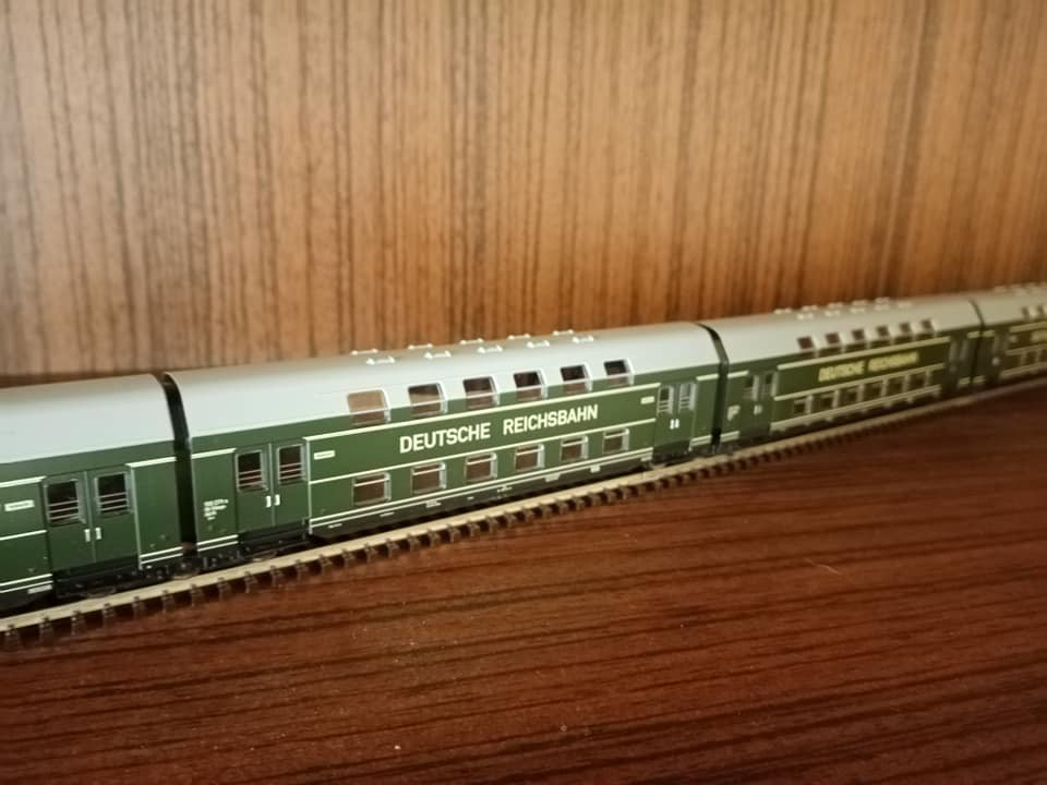 "W weekend gościnnie pojeździ na makiecie zestaw z trzeciej ep. Jazda prototypu za parowóz w planie dalekobieżnym maszyn serii 01/03. Wagony różnych trzech typów bo nie zawsze w oryginale w składzie jeździły wagony jednorodne."
