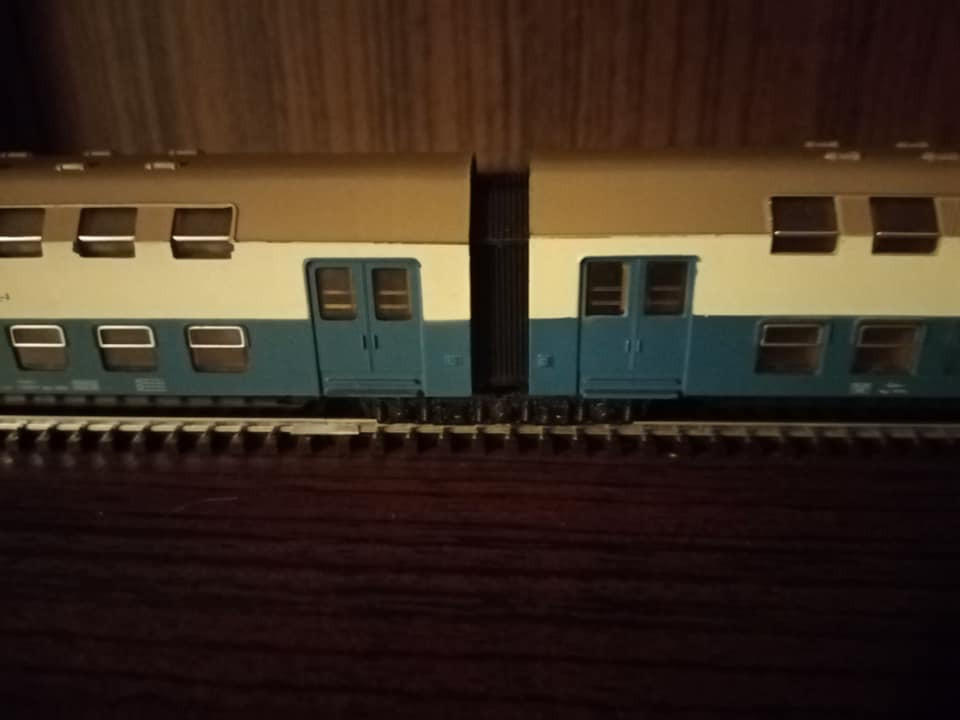 "Późniejsze BTTB. Wersja 110ki ze światłami weszła od 1987r tak samo jak nowe malowanie Bipy. Niestety nie posiadam dwuczłonu środkowego tej wersji, ale w oryginale takie składy też jeździły. Typowy pociąg pracowniczy szkolny DR. Charakterystyczne pudełko tamtego okresu na którym podobały mi się namalowane składy."