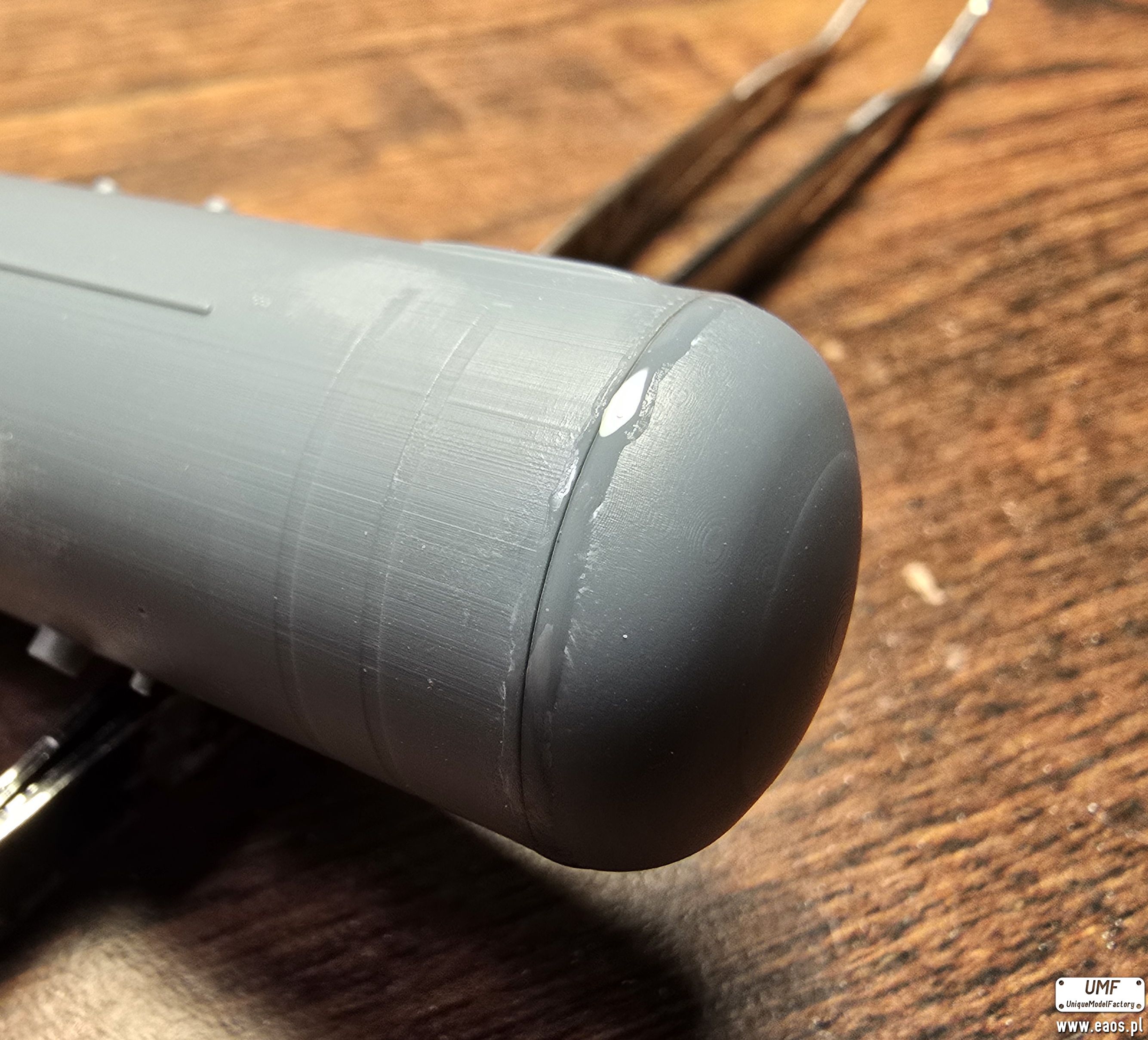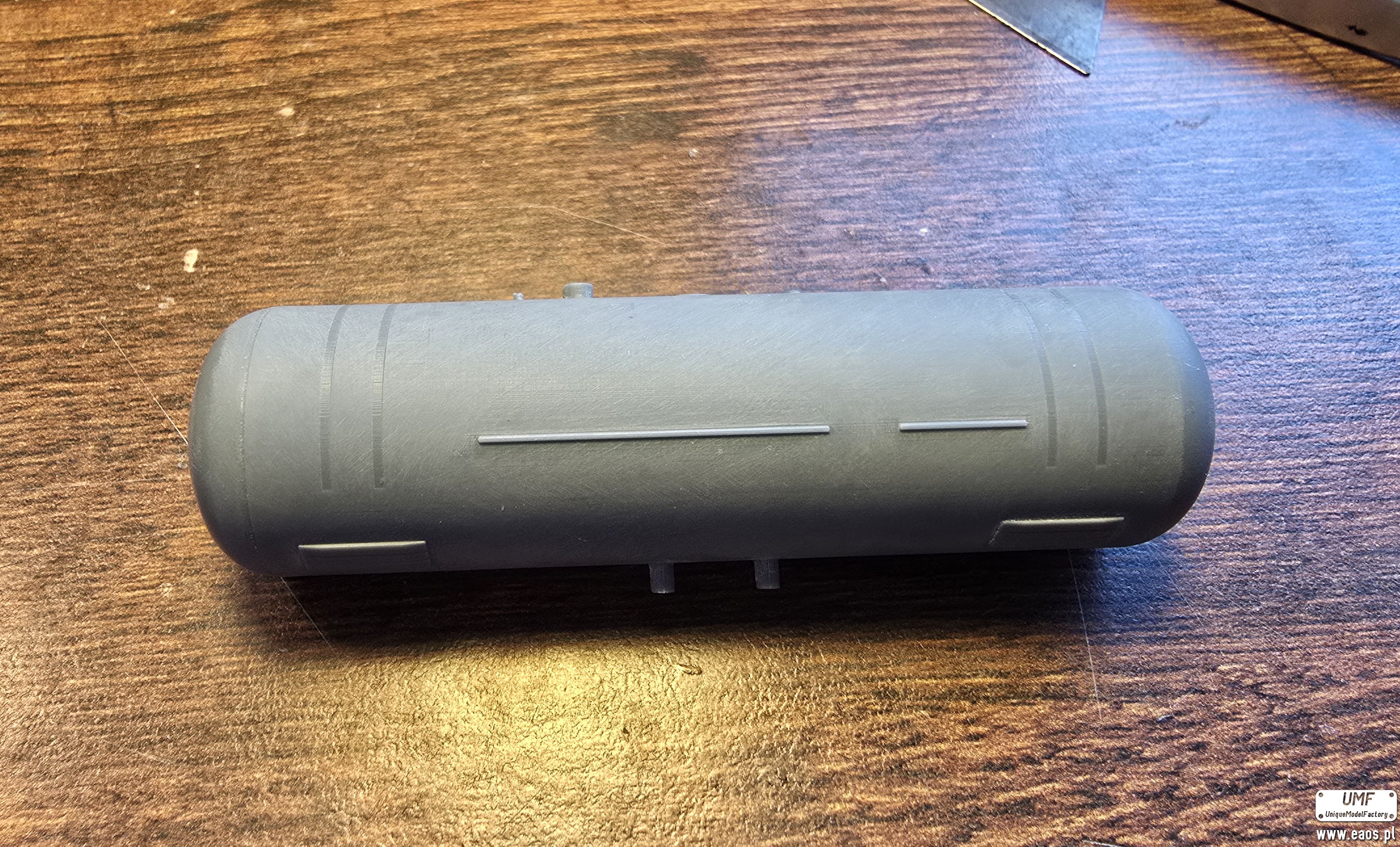 Po wyszlifowaniu połączenia cały zbiornik przeszlifowałem zgrubnie papierem 400. Papier wodny oczywiście na sucho. Wnęk na pasy oczywiście nie szlifujemy.