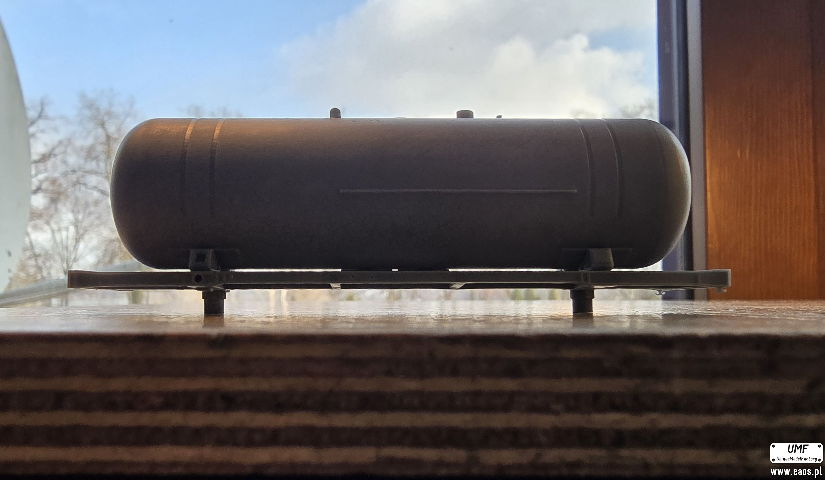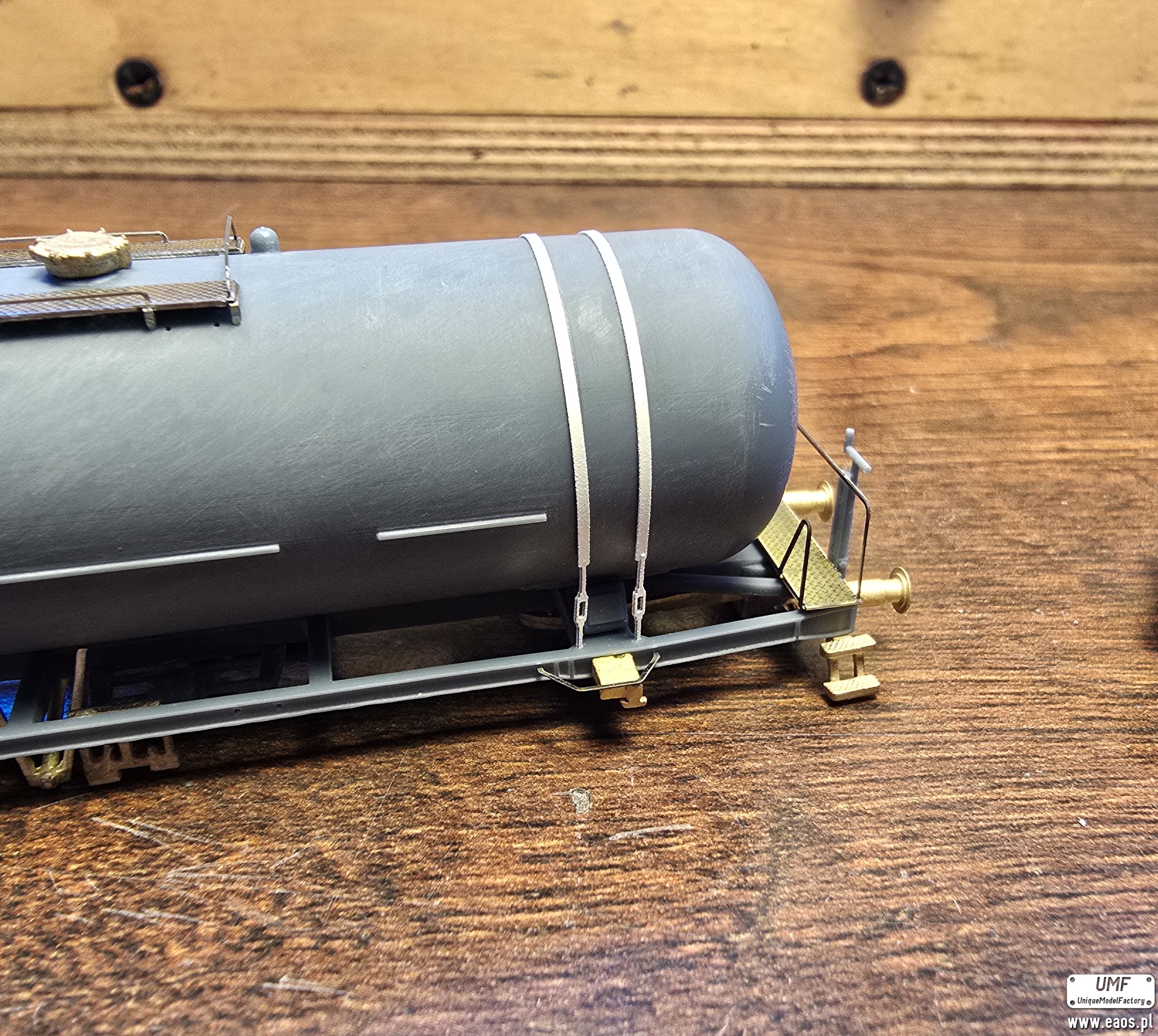 Po założeniu zbiornika pasy przeciągamy przez otwory. Nadmiar obcinamy i zaginamy po odpowiednim napięciu i ustawieniu w rowkach na zbiorniku. Sam zbiornik też bym przykleił w miejscach tych dwóch wpustów od spodu.