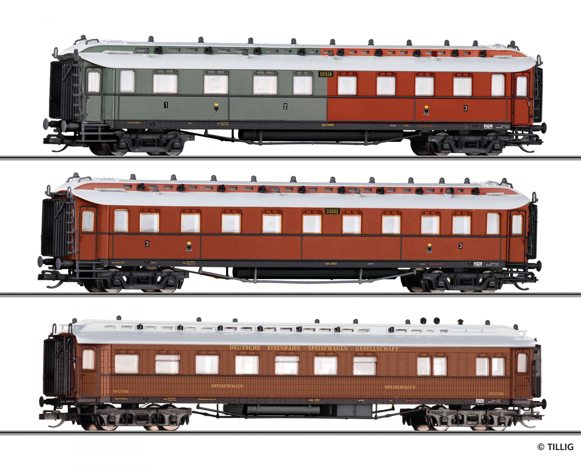Tillig@FB informuje o dostawie:01085 Zestaw wagonów pasażerskich „Pruski pociąg ekspresowy” K.P.E.V., składający się z: wagonu osobowego 1/2/3 klasy, wagonu osobowego klasy 3 i wagonu restauracyjnego Ep. I, część 2, w dostawie do specjalistycznych dealerów TILLIG