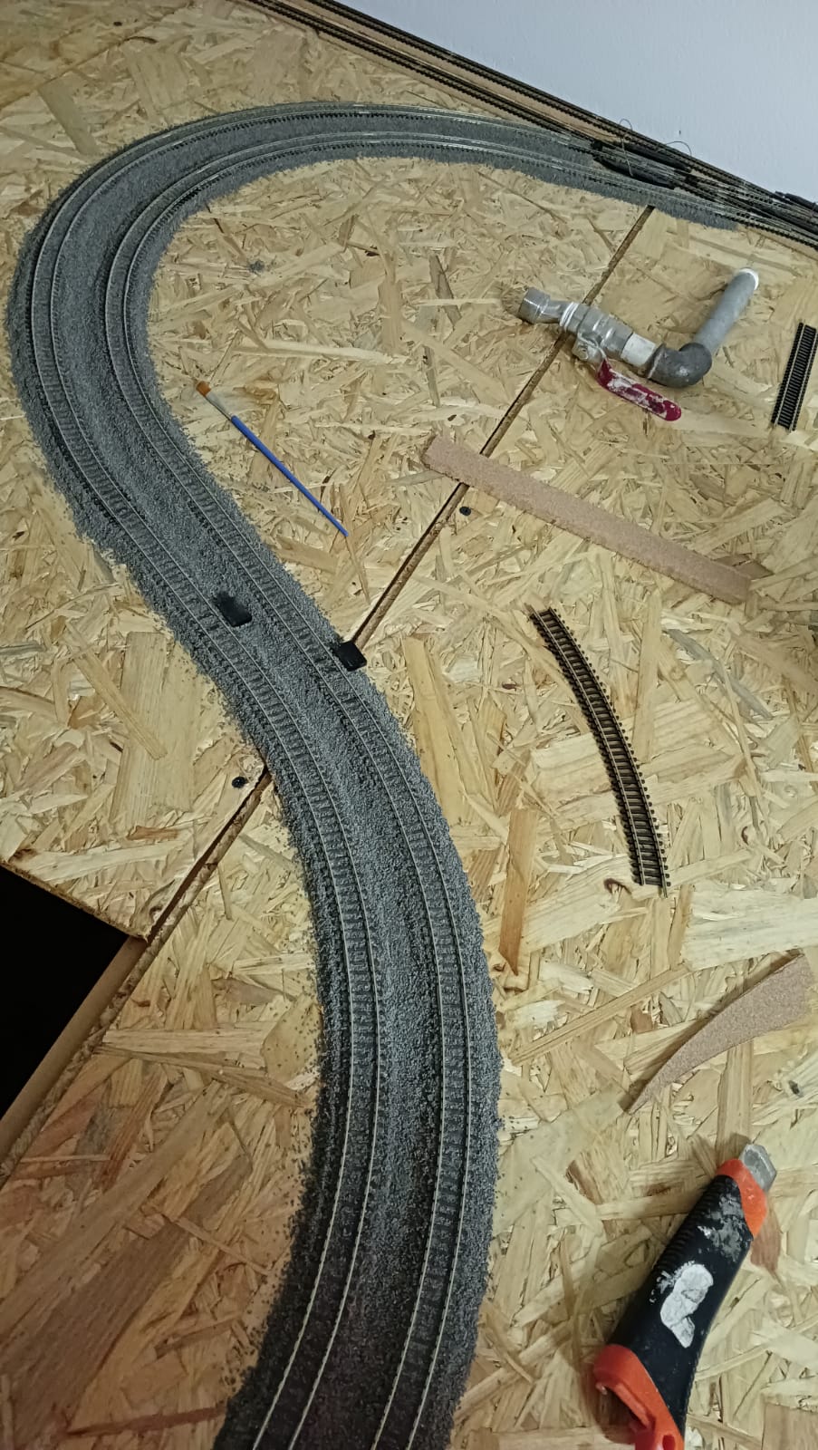 Tak na moje oko trochę te tory krzywo położone, ładniej by było dla oka bardziej prosto i chyba trochę blisko krawędzi makiety. Szkoda taboru aby spadł.