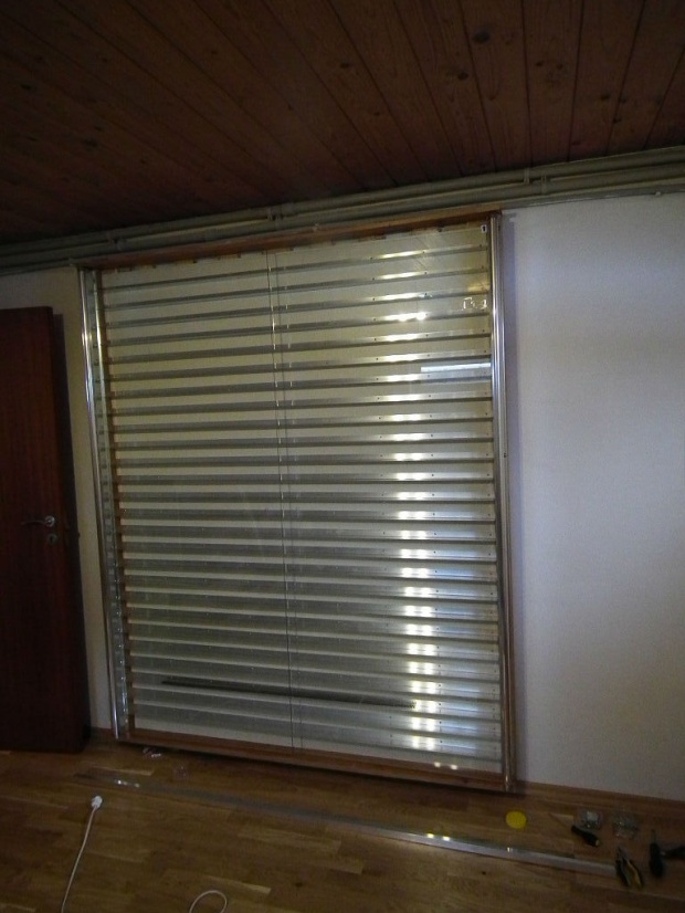 „Szybę” stanowią 2 płyty plexi 50x100cm (grub. 2mm). Wstawia się je pomiędzy profile typu U, umocowane do górnej i dolnej ramy.