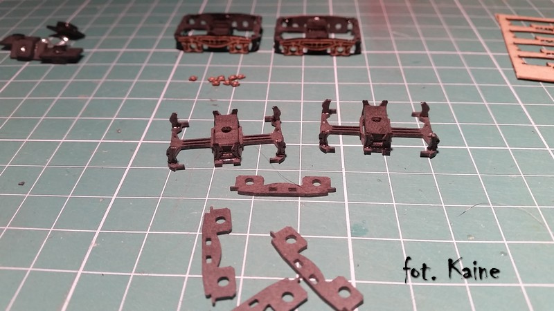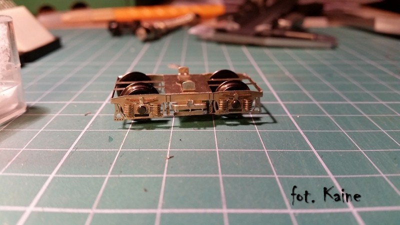 Wózek jest wykonany z preszpanu i z kartonu, jednak tam gdzie wchodzą osie metalowe sa łożyska pecho które są stosowane w starych wagonach BTTB