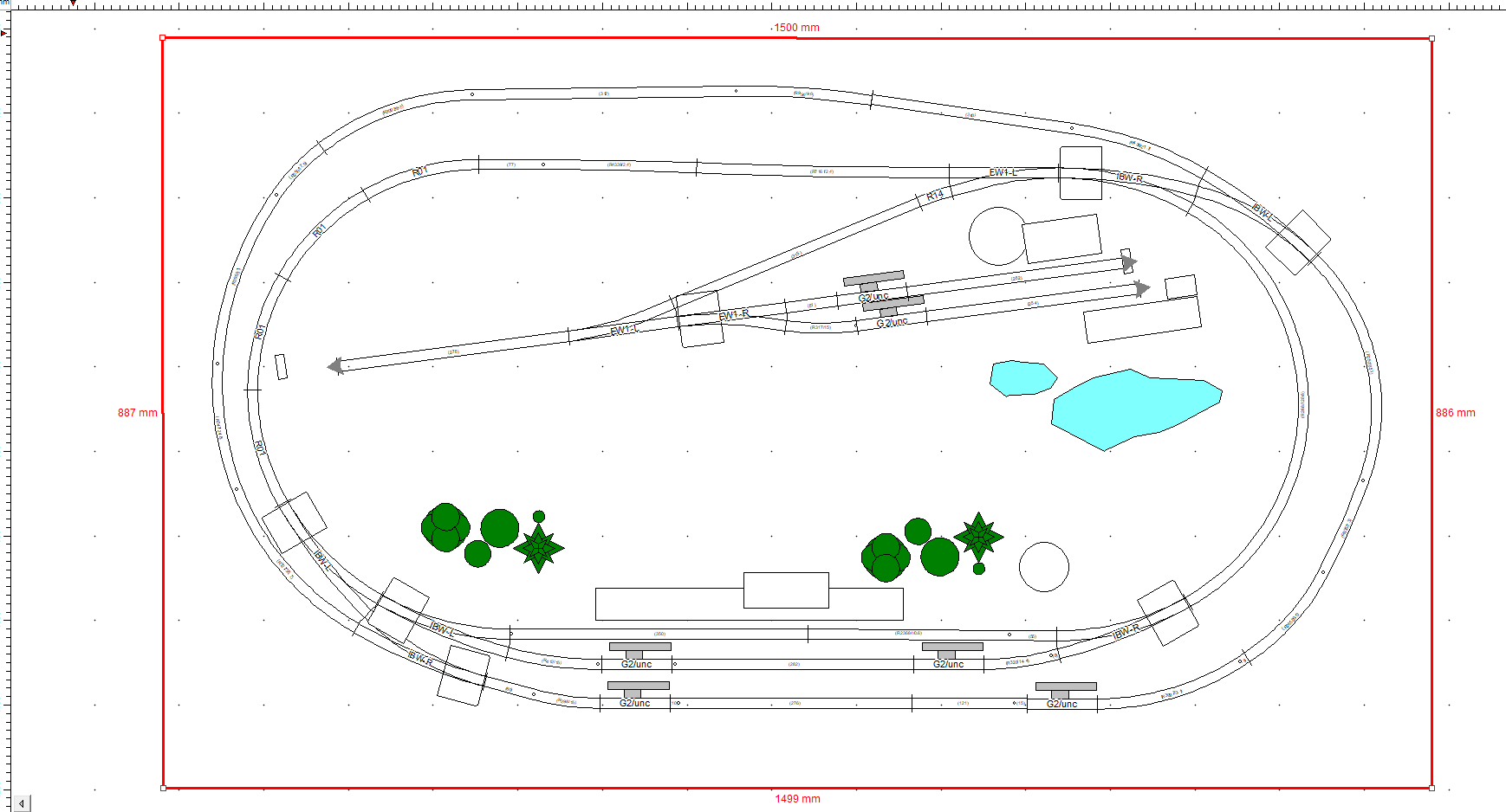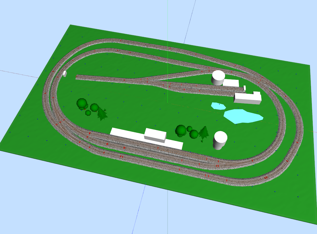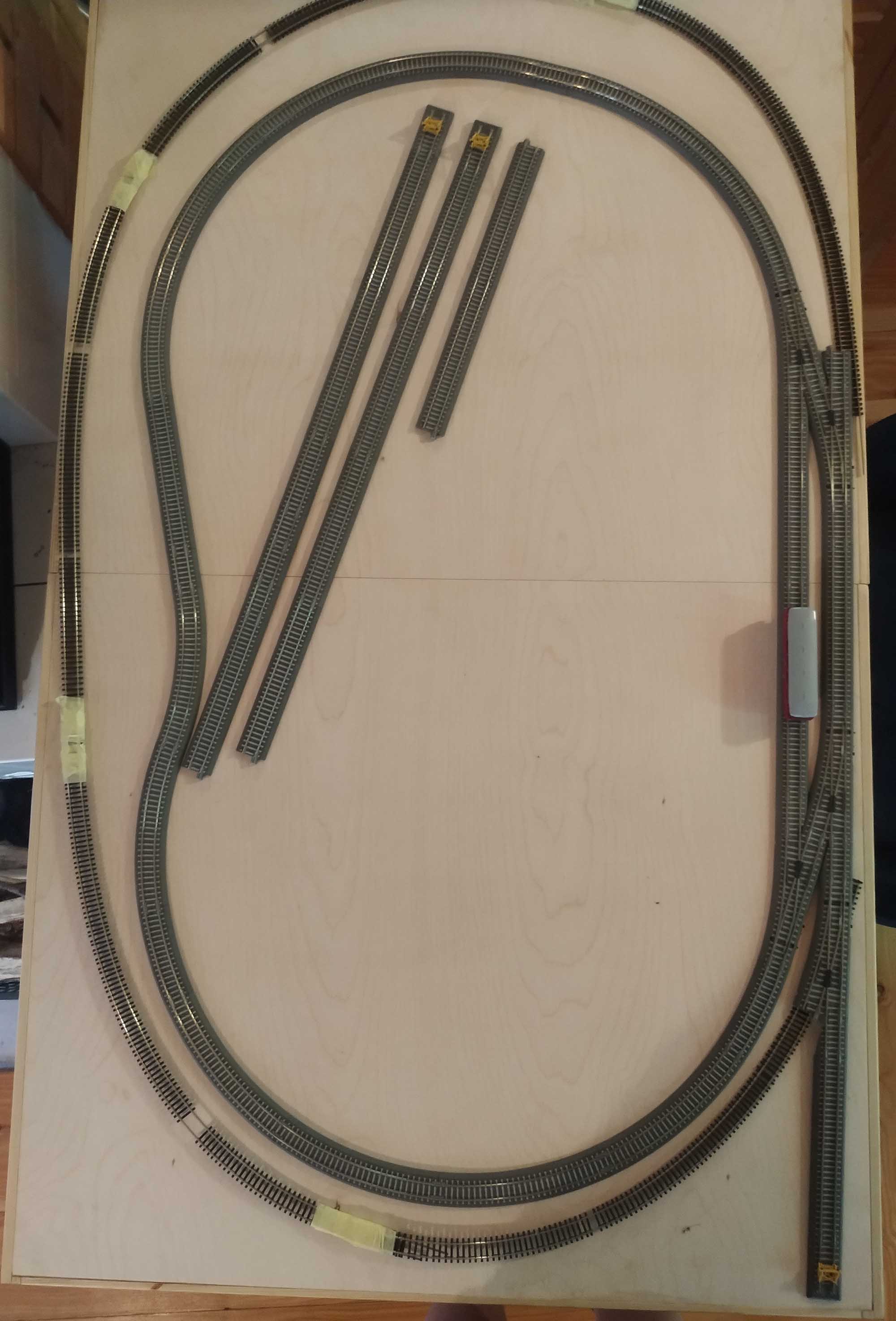 Spoko układ, ja buduję ciut mniejszy tort o podobnym przeznaczeniu. Rozciągnąłbym układ w pionie tak aby zmieścić łuki o jak największym promieniu. Mam zewnętrzny R=353 i jeden z parowozów wypada przednim wózkiem.
