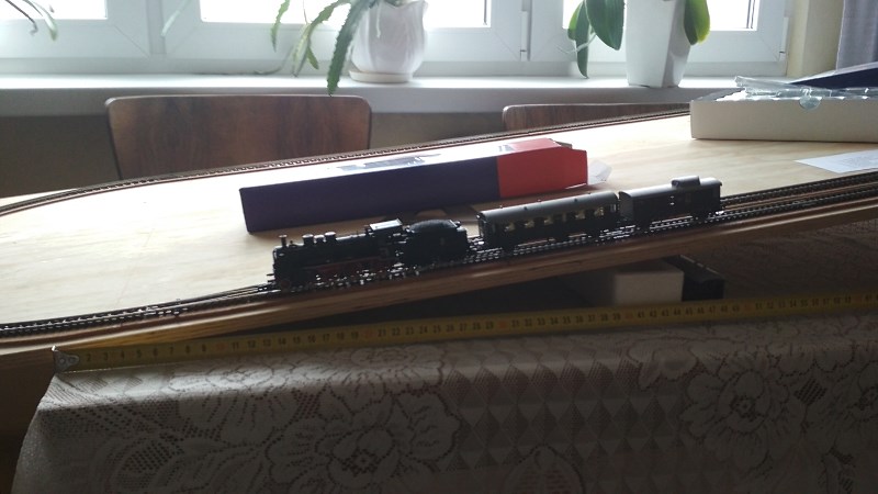 Być może uda mi się podnieść nieco część torów by zniwelować wysokość faktycznego podjazdu. Jeśli podniosę lewą część makiety o 2 cm stromość podjazdów zmniejszy się o 1/3 a długość podjazdu wydłuży.