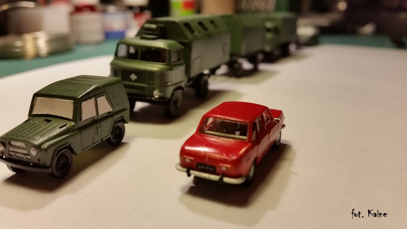 Nabyty za dewizy przejeżdża wzdłuż zaparkowanej kolumny wojskowej...