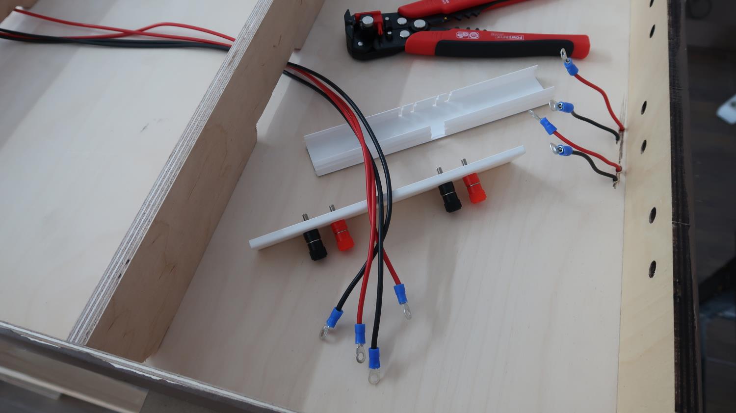 W spodniej części modułu, na końcach pobielonych przewodów zaciskam konektory oczkowe. Z korytka kablowego 32x15mm przygotowuję odcinki 200 mm, w których montuję cztery gniazda bananowe na wtyk 4mm, w kolorach izolacji przewodów – czarnym i czerwonym. Przygotowuję cztery przewody łączące odpowiednie punkty pod makietą, analogicznie jak szyny na makiecie. Przewody te tworzą tzw. magistralę, z której poprzez szyny zasilane są pociągi na danym module, a przez złącza bananowe zasilane są kolejne moduły makiety.