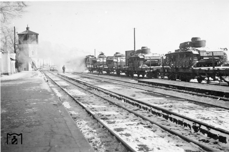Ein mit Panzern beladener Zug wartet in einem Bahnhof nahe Minsk auf Weiterfahrt an die Front. (1943) Foto: RVM (Bandelow)