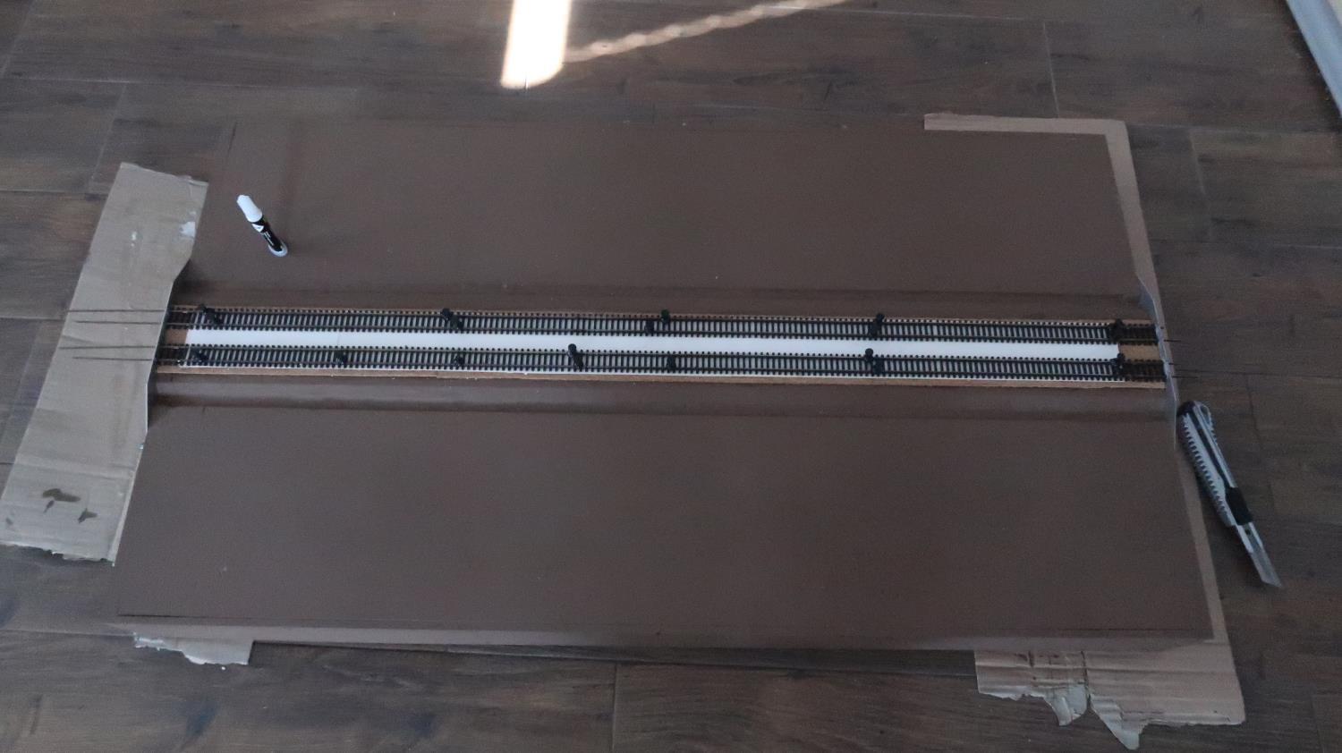 Błąd ten został skorygowany poprzez uzupełnienie brakującego milimetra tekturą modelarską o takiej grubości. Finalnie i tak całość korka na podtorzu (ślepa podsypka) zostanie zasypana tłuczniem.