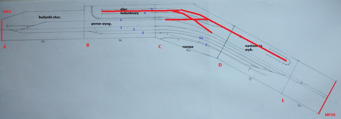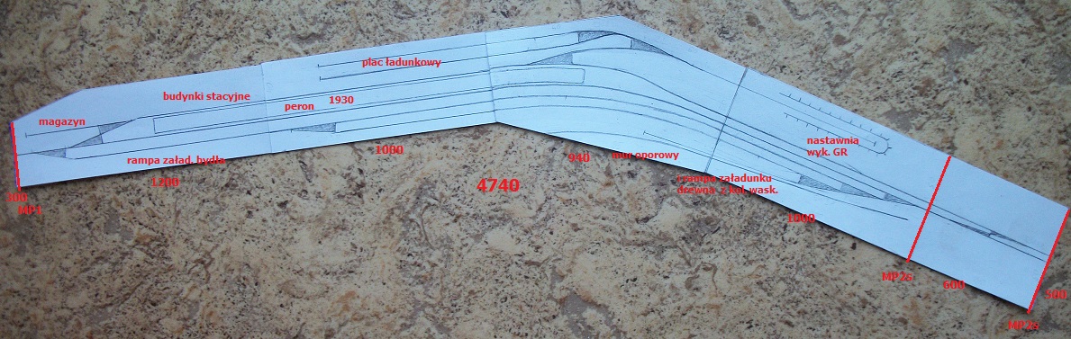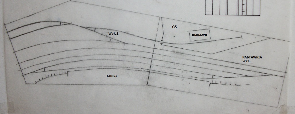 W związku z tym, że na dostępnej przestrzeni nie udało się pogodzić łuku i spadku toru, postanowiłem , że plac ładunkowy będzie się znajdował na poziomie równi stacyjnej. Stąd zmieniłem kierunek dojazdu do placu, a w miejsce toru wyciągowego powstała bocznica z magazynem GS-u.