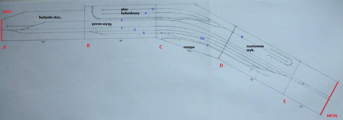 Ostateczny projekt rozbudowy stacji. Łączna długość modułu 466,5 cm. Poziom placu ładunkowego jest zaniżony w stosunku do równi stacyjnej, a nachylenie torów dojazdowych nie przekroczy 20 promili. Tory na placu - nachylenie 0 promili. Dziś przystępuję do realizacji segmentu B.