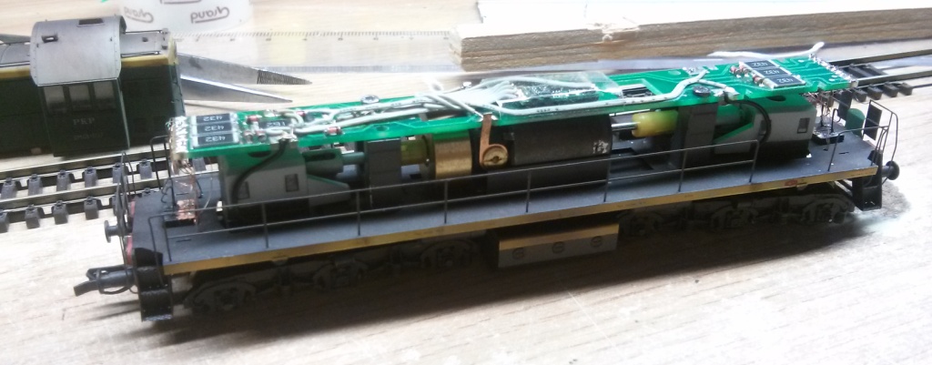 . Co się zmieniło ? Ano ułożenie wszystkiego, rezystory oraz diody prostownicze poszły na mniejsze dwie płytki na końcach lokomotywy, na górnej powierzchni głównej płytki poszły elementy zasilania UPS (dławik, dioda, rezystor) oraz sam dekoder MX620. Mocowanie płytki musiało być zmodyfikowane z jednej strony na blaszki zaginane do środka z drugie strony wszystko bez zmian. Aby zmieścić kondensator 1000uF musiałem pozbyć się jednej szfugmasy oraz wyciąć trochę mocowania płytki(trochę...). Wszystkie opcje płytki pozostały bez zmian.