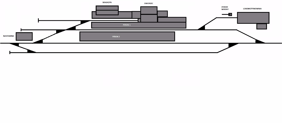 Ok, dzisiaj przerysowałem schemat stacji by był przynajmniej częściowo zgodny z normami. Magazyn z rampą został przyklejony do płyty dworca, nastawnia również zmieniła pozycję oraz perony zostały umiejscowione: Peron 2 - tor główny, Peron 1 - tor główny dodatkowy.