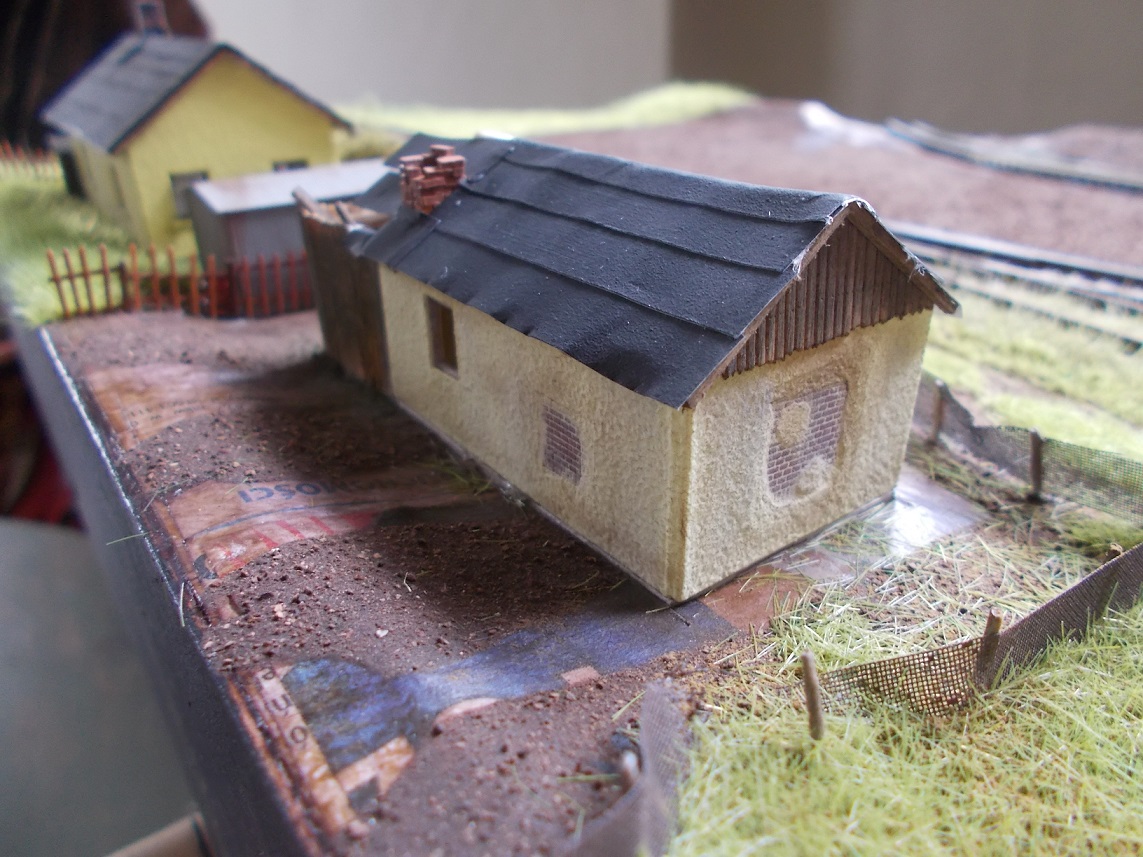 Korzystając z pierwszego dnia urlopu postanowiłem zagospodarować działkę obok. Od razu przyznaję, że komin wymurowałem z cegieł H0 ponieważ innych nie miałem, natomiast dałem ciała z drewnianą częścią ponieważ w środku jej nie postarzyłem, ale jak kleje powysychają spróbuję coś zadziałać w tym temacie. Na chwilę obecną wygląda to tak, dodam jeszcze trochę zieleni + drzewka i może duże drzewo, ale to już przy świetle dziennym. Zdjęcia w większości robione przy sztucznym świetle a fotograf ze mnie żaden więc wybaczcie jakość