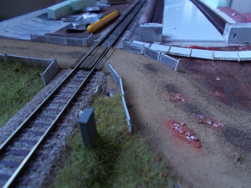 Fotorelacji dawno nie było choć jakieś prace były robione. Tym razem zabrałem się za 4 ostatnią skrzynkę, poprawiłem przejazd i drogę, załatałem gruzem i żużlem dziury. Przejazd jest wzorowany na przejazdach z linii Katowice-Kraków jeśli chodzi o płoty betonowe, docelowo będą zamontowane jeszcze latarnie po obu stronach i nieczynny semafor wjazdowy (będzie tuż przed przejazdem tam gdzie z ziemi wystają 2 płytki betonowe. W tle widać plac ładunkowy przy którym zaczynam niewielkie prace. Nie będę jeszcze zdradzał jakie mam względem niego plany żeby nie zapeszać;)