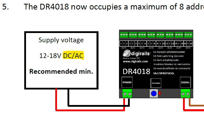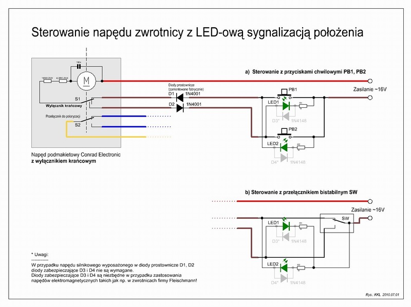 Dla większości przypadków, taka sytuacja nie jest problemem, ale Conrad zastosował rozwiązanie, które wymaga podłączenia silnika raz PLUS do MINUS, a w drugą stronę MINUS do PLUS. Uzyskujemy taką sytuację zasilając Conrady z napięcia zmiennego poprzez (dolutowane) diody prostownicze. Jednak w przypadku dekodera Digikejs dostajemy 2 razy tą samą polaryzację, co powoduje, że dekoder przerzuca tylko w jedną stronę i nie wraca.