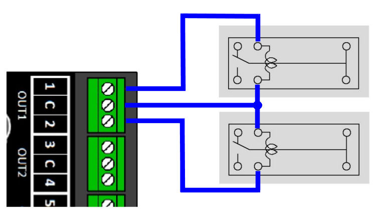 Przekaźniki pełnią funkcję przycisków PB1/PB2 z rysunku "a". Dekoder, po podaniu polecenia przerzucenia rozjazdu, podaje na zaciskach wyjściowych ("1" albo "2") napięcie przez ok. 2 sekundy co wystarczy do przestawienia napędu, po czym napięcie zanika. Oczywiście można dekoder przeprogramować do realizowania innego scenariusza, np. podawania zasilania cały czas (jak dla LED czy żaróweczki).