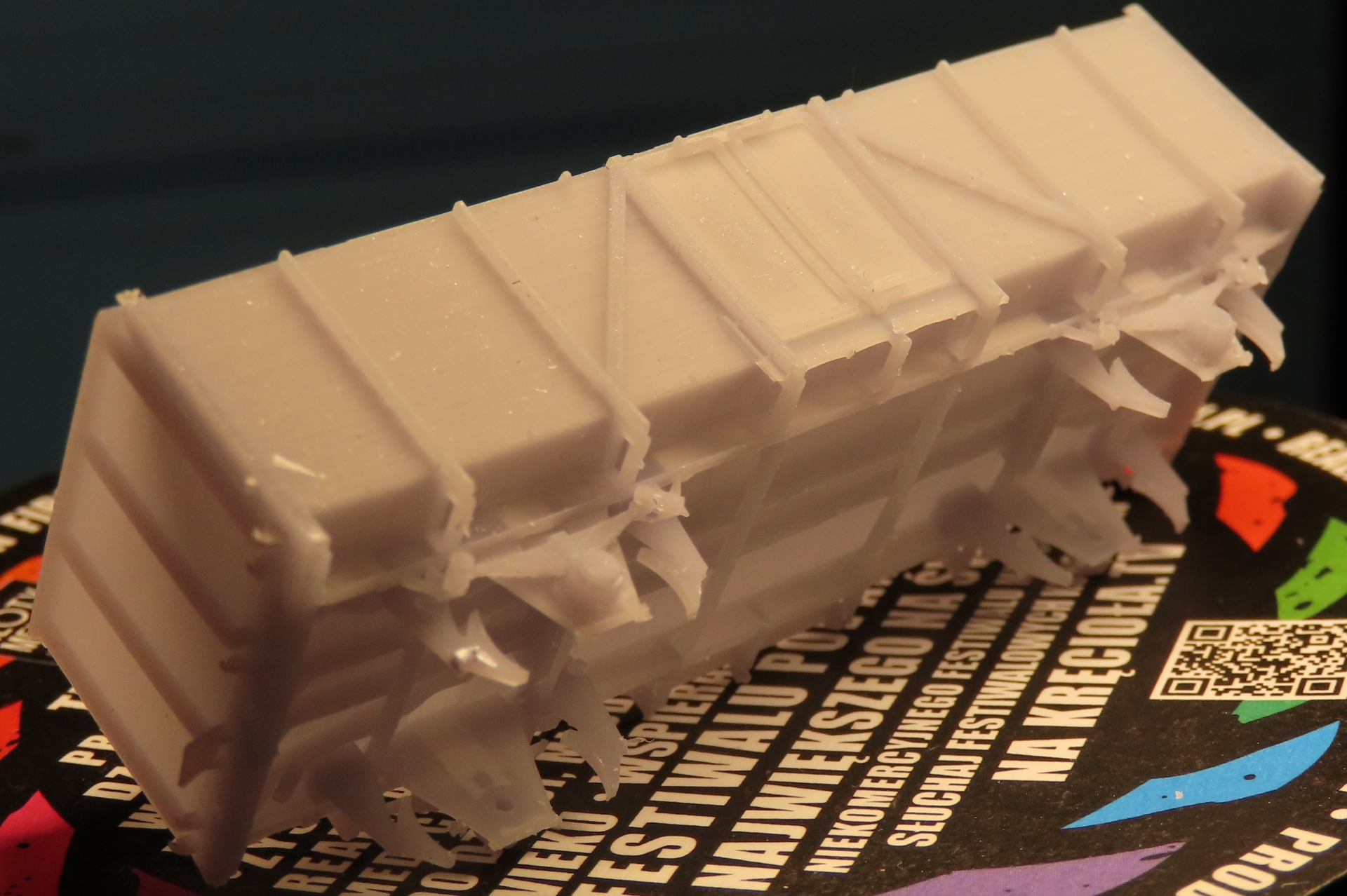 Jakość bez zarzutu. Wyszły nawet najdrobniejsze elementy układu blokady drzwi. Problem podpór jednak pozostał. Podpory przy takich detalach są nie do usunięcia (ww. układ blokady od strony przeciwnej podpory zmasakrowały). Jedyne co pozostaje to podzielić bryłę na kawałki: 2 przody, 2 boki i ostoja i wydrukować osobno zewnętrzem do góry i ostoję dołem do góry. Usunięcie podpór od wewnątrz powinno się udać bez problemów z tym, że pewnie łby śrub mocujących szalunek będą do usunięcia.